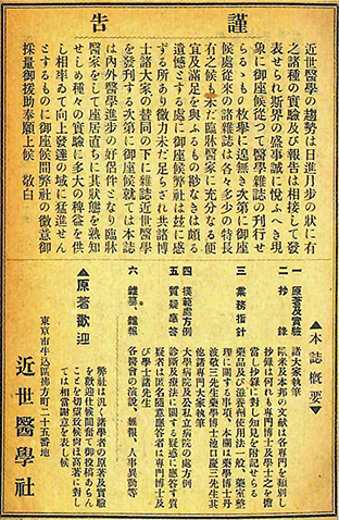 この頃、「近世医学」のみでなく、他にもいくつかの臨床医学雑誌が創刊されていたようで、この時代は医学雑誌の黎明期とも呼べるかもしれません。