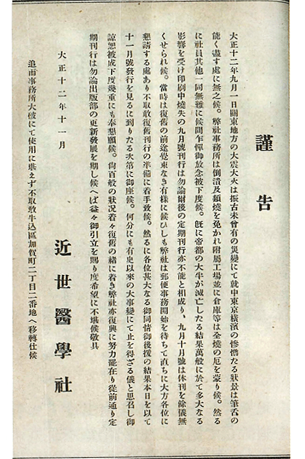 このように順調に進んでいた「近世医学社」ですが、大正12年に発生した関東大震災では、東京・牛込に本社があったこともあり、本社社屋の倒壊は免れたものの、工場や倉庫は全焼し、既に印刷済みであった発行前の雑誌がすべて焼失するなど、甚大な被害を受けました。これを機に、雑誌名を「近世医学」から「診断と治療」に改め(社名も「診断と治療社」に改めました )、震災からの復興に努め、社屋も堅固な東京・丸の内のビル(三菱21号館)に移転しました(ちなみに虚子の主宰していたホトトギスの発行所は旧丸ビルに入っていました) 。