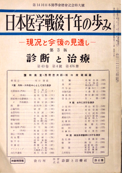 昭和初期頃の診断と治療の編集委員には、西野忠次郎先生、茂木蔵之助先生、坂口康蔵先生、平松濤平先生、植松七九郎先生、田中幸一先生、大森憲太先生、佐藤太平先生等錚々たる先生が就かれていたとのことです。