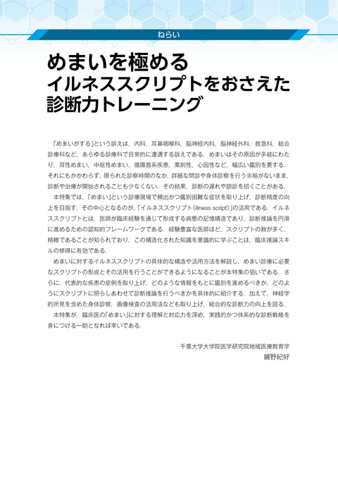 めまいに対するイルネススクリプトの具体的な構造や活用方法を解説し,めまい診療に必要なスクリプトの形成とその活用を行うことができるようになることが本特集の狙いである.さらに,代表的な疾患の症例を取り上げ,どのような情報をもとに鑑別を進めるべきか,どのようにスクリプトに照らしあわせて診断推論を行うべきかを具体的に紹介する.加えて,神経学的所見を含めた身体診察,画像検査の活用法なども取り上げ,総合的な診断力の向上を図る.