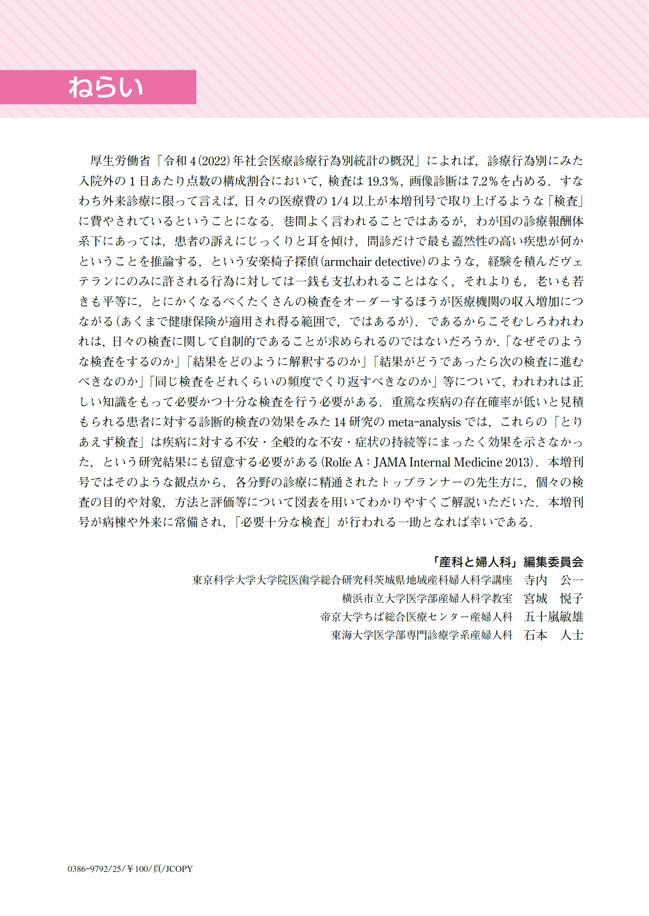 厚生労働省「令和4(2022)年社会医療診療行為別統計の概況」によれば,診療行為別にみた入院外の1日あたり点数の構成割合において,検査は19.3%,画像診断は7.2%を占める.すなわち外来診療に限って言えば,日々の医療費の1/4以上が本増刊号で取り上げるような「検査」に費やされているということになる.巷間よく言われることではあるが,わが国の診療報酬体系下にあっては,患者の訴えにじっくりと耳を傾け,問診だけで最も蓋然性の高い疾患が何かということを推論する,という安楽椅子探偵(armchair detective)のような,経験を積んだヴェテランにのみに許される行為に対しては一銭も支払われることはなく,それよりも,老いも若きも平等に,とにかくなるべくたくさんの検査をオーダーするほうが医療機関の収入増加につながる(あくまで健康保険が適用され得る範囲で,ではあるが).であるからこそむしろわれわれは,日々の検査に関して自制的であることが求められるのではないだろうか.「なぜそのような検査をするのか」「結果をどのように解釈するのか」「結果がどうであったら次の検査に進むべきなのか」「同じ検査をどれくらいの頻度でくり返すべきなのか」等について,われわれは正しい知識をもって必要かつ十分な検査を行う必要がある.重篤な疾病の存在確率が低いと見積もられる患者に対する診断的検査の効果をみた14研究のmeta-analysisでは,これらの「とりあえず検査」は疾病に対する不安・全般的な不安・症状の持続等にまったく効果を示さなかった,という研究結果にも留意する必要がある(Rolfe A:JAMA Internal Medicine 2013).本増刊号ではそのような観点から,各分野の診療に精通されたトップランナーの先生方に,個々の検査の目的や対象,方法と評価等について図表を用いてわかりやすくご解説いただいた.本増刊号が病棟や外来に常備され,「必要十分な検査」が行われる一助となれば幸いである.