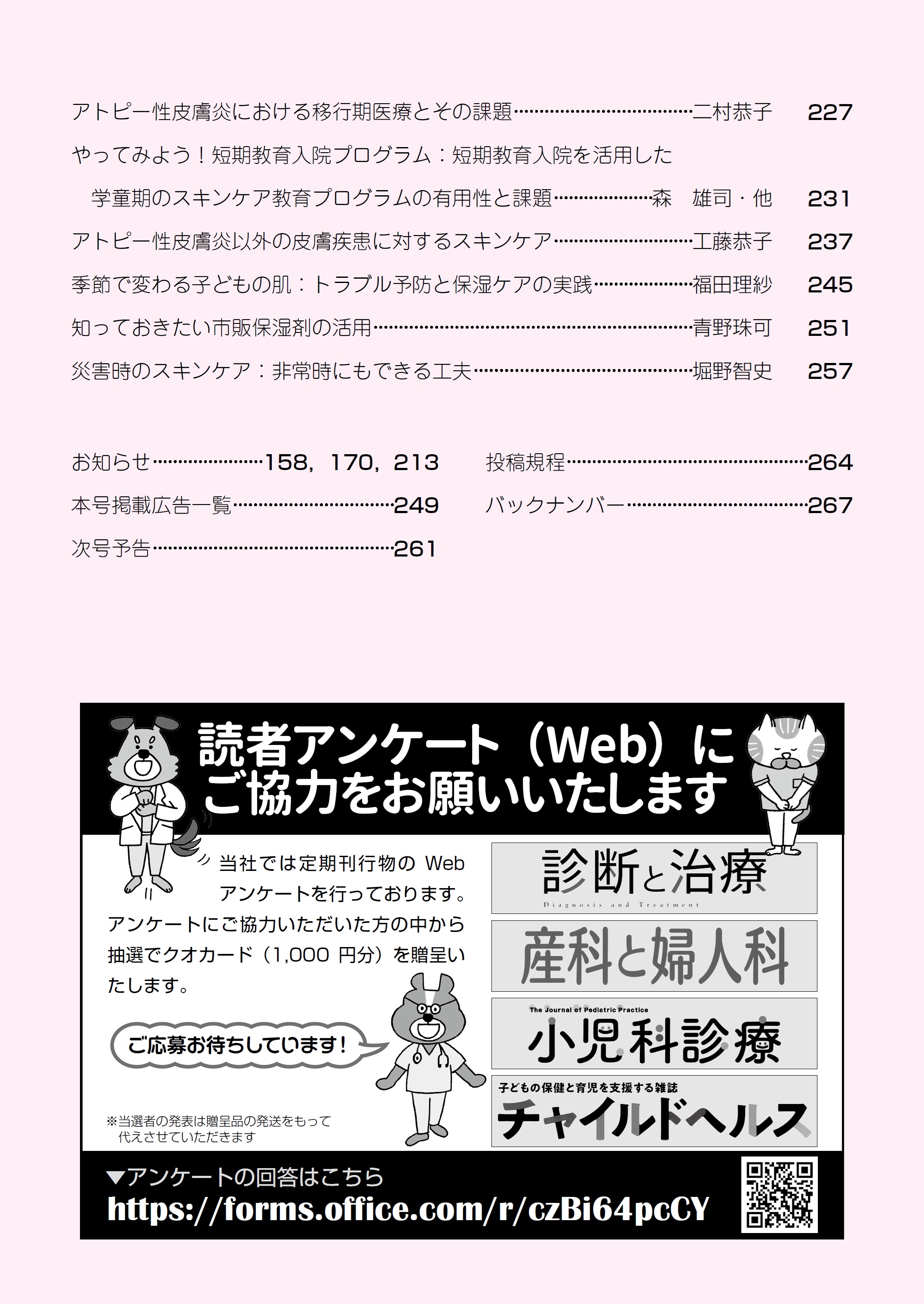 中盤以降では,新生児・乳児の入浴と保湿の実際,患児が自分でできる!ようになるための学童期以降のスキンケア支援,OTC 保湿剤の上手な選びかたと保護者への説明,おむつ皮膚炎・非感染性外陰部瘙痒症・思春期痤瘡や脂性肌といったコモンな皮膚トラブルへの対応,先天性魚鱗癬など基礎疾患をもつ子どもにおける診療のポイントを具体的に解説しました.さらに,スキンケア教育入院や短期入院プログラム,多職種で取り組む保健指導の実際,災害時の限られた資源下でのスキンケア,そして保湿剤開発やバイオマーカー研究など未来に向けた展望にもふれています.