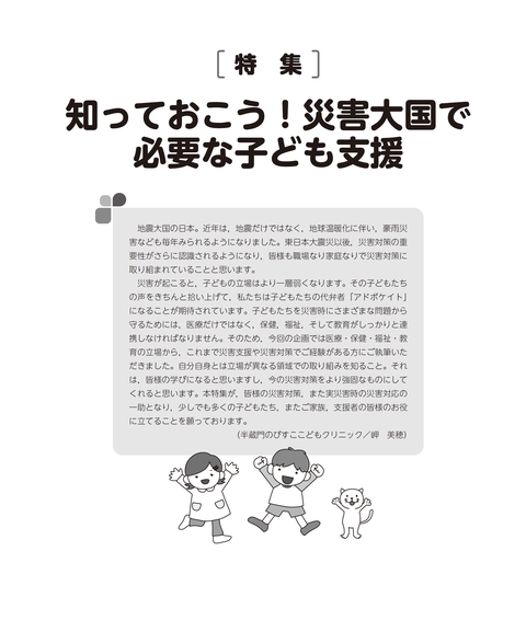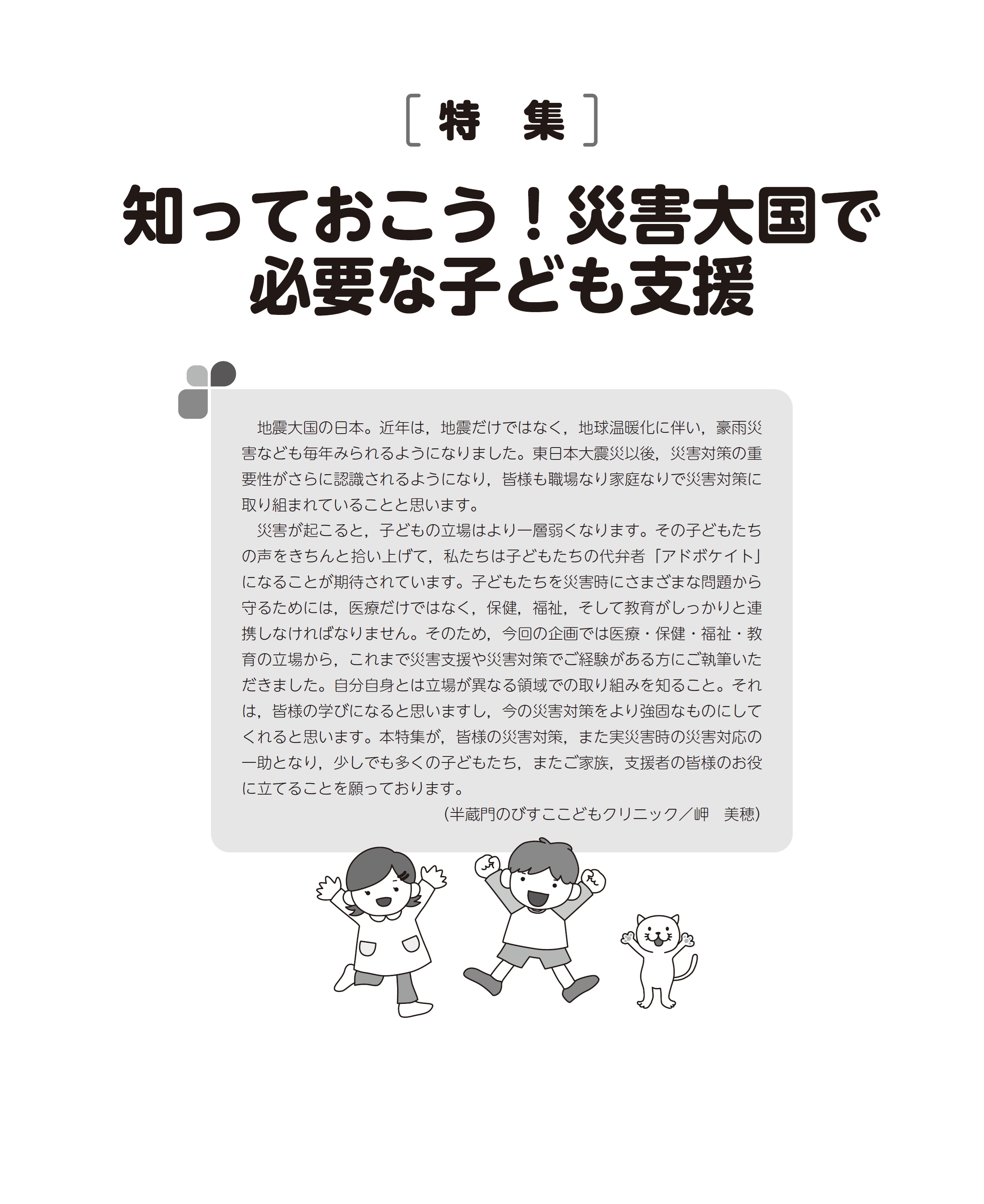 災害が起こると,子どもの立場はより一層弱くなります.その子どもたちの声をきちんと拾い上げて,私たちは子どもたちの代弁者「アドボケイト」になることが期待されています.子どもたちを災害時にさまざまな問題から守るためには,医療だけではなく,保健,福祉,そして教育がしっかりと連携しなければなりません.そのため,今回の企画では医療・保健・福祉・教育の立場から,これまで災害支援や災害対策でご経験がある方にご執筆いただきました.自分自身とは立場が異なる領域での取り組みを知ること.それは,皆様の学びになると思いますし,今の災害対策をより強固なものにしてくれると思います.本特集が,皆様の災害対策,また実災害時の災害対応の一助となり,少しでも多くの子どもたち,またご家族,支援者の皆様のお役に立てることを願っております.