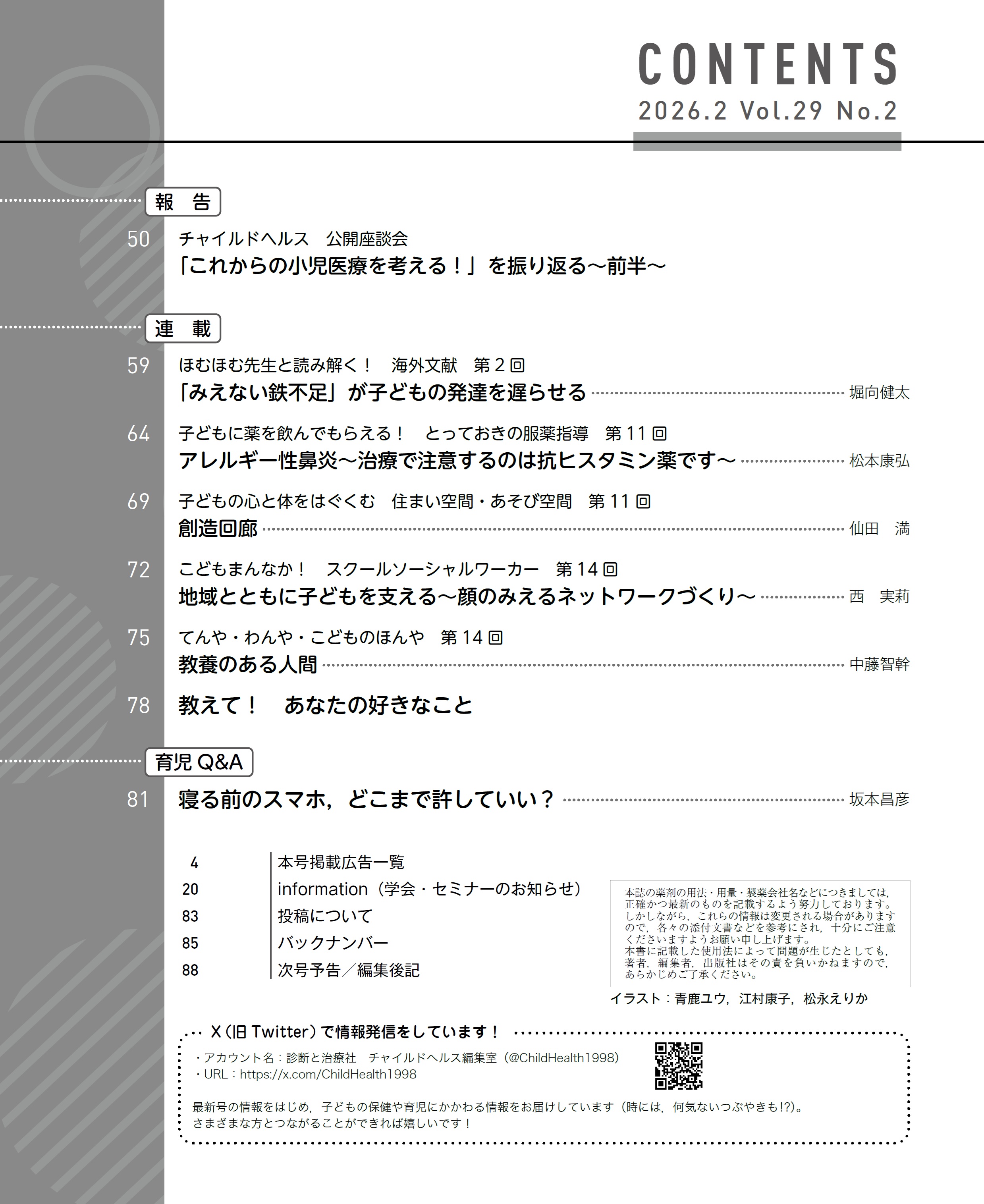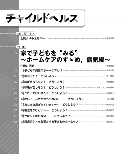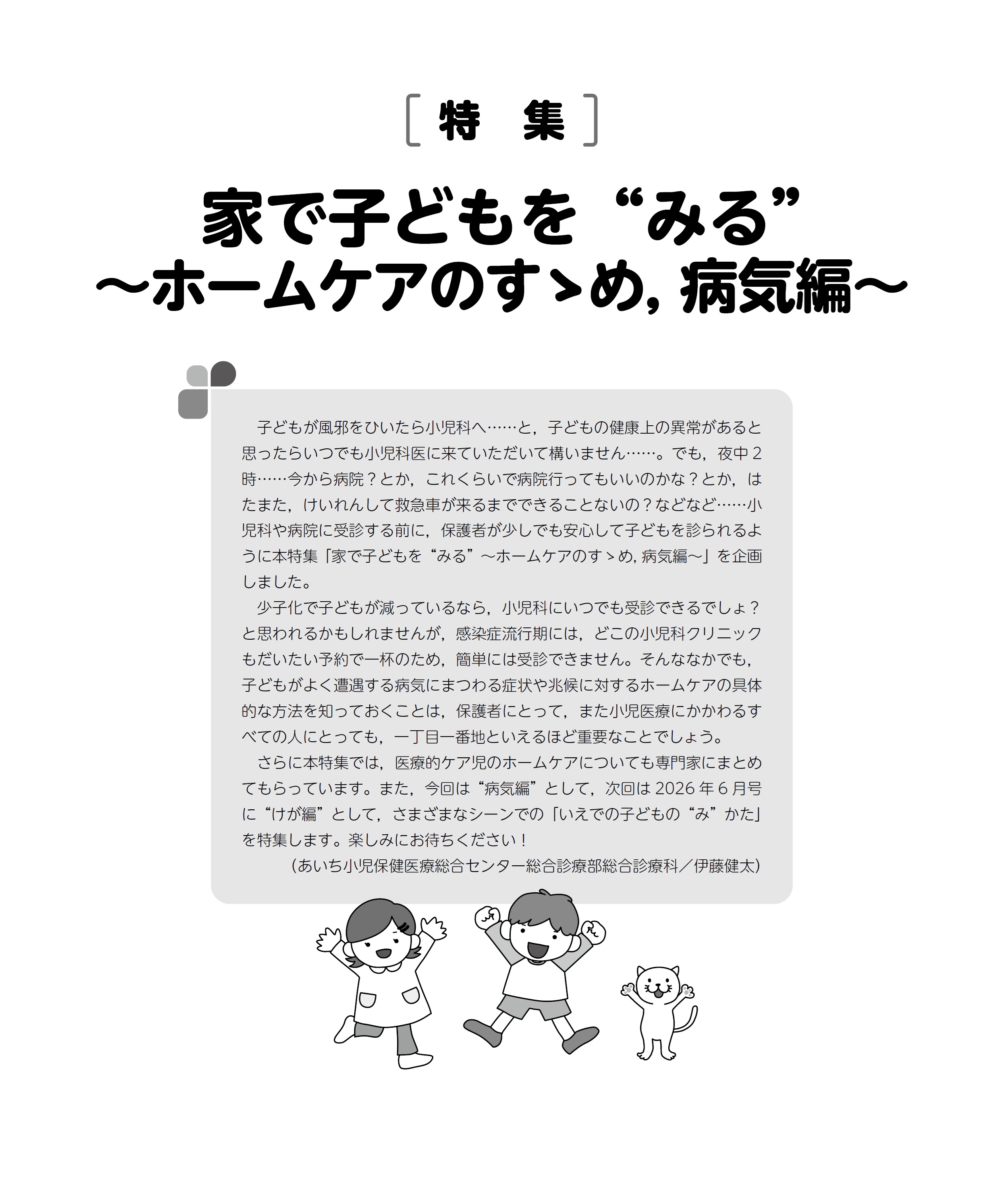 さらに本特集では,医療的ケア児のホームケアについても専門家にまとめてもらっています.また,今回は“病気編”として,次回は2026年6月号に“けが編”として,さまざまなシーンでの「いえでの子どもの“み”かた」を特集します.楽しみにお待ちください!