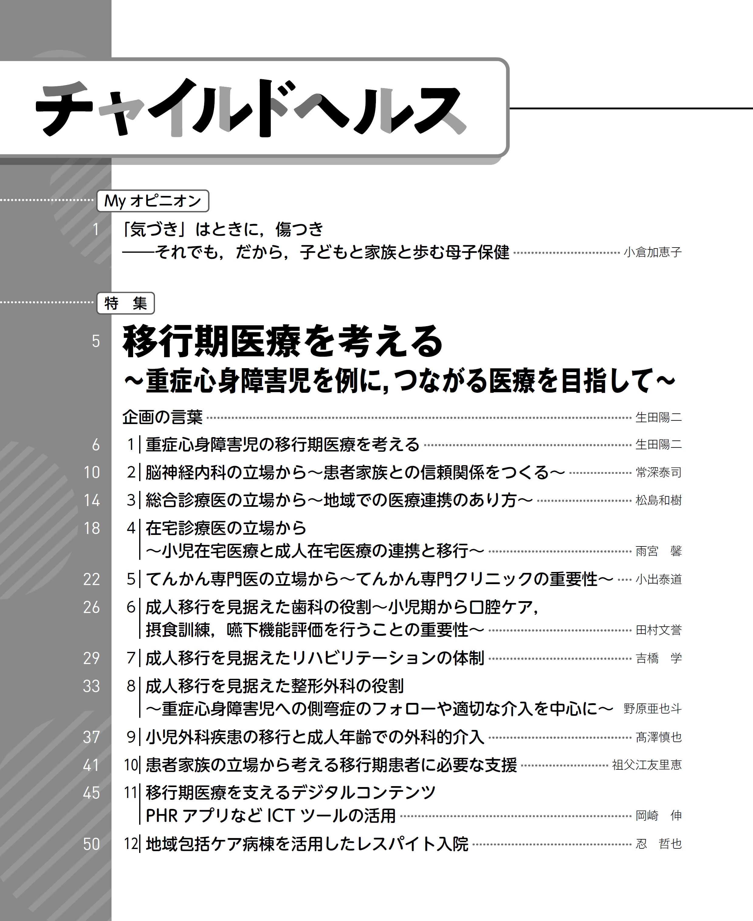 個別性の高い移行期医療ですが,本特集の実践的な知見が,読者の皆さまの地域や施設において,患者一人ひとりに最適な「つながる医療」を構築する一助となることを心より願っています.