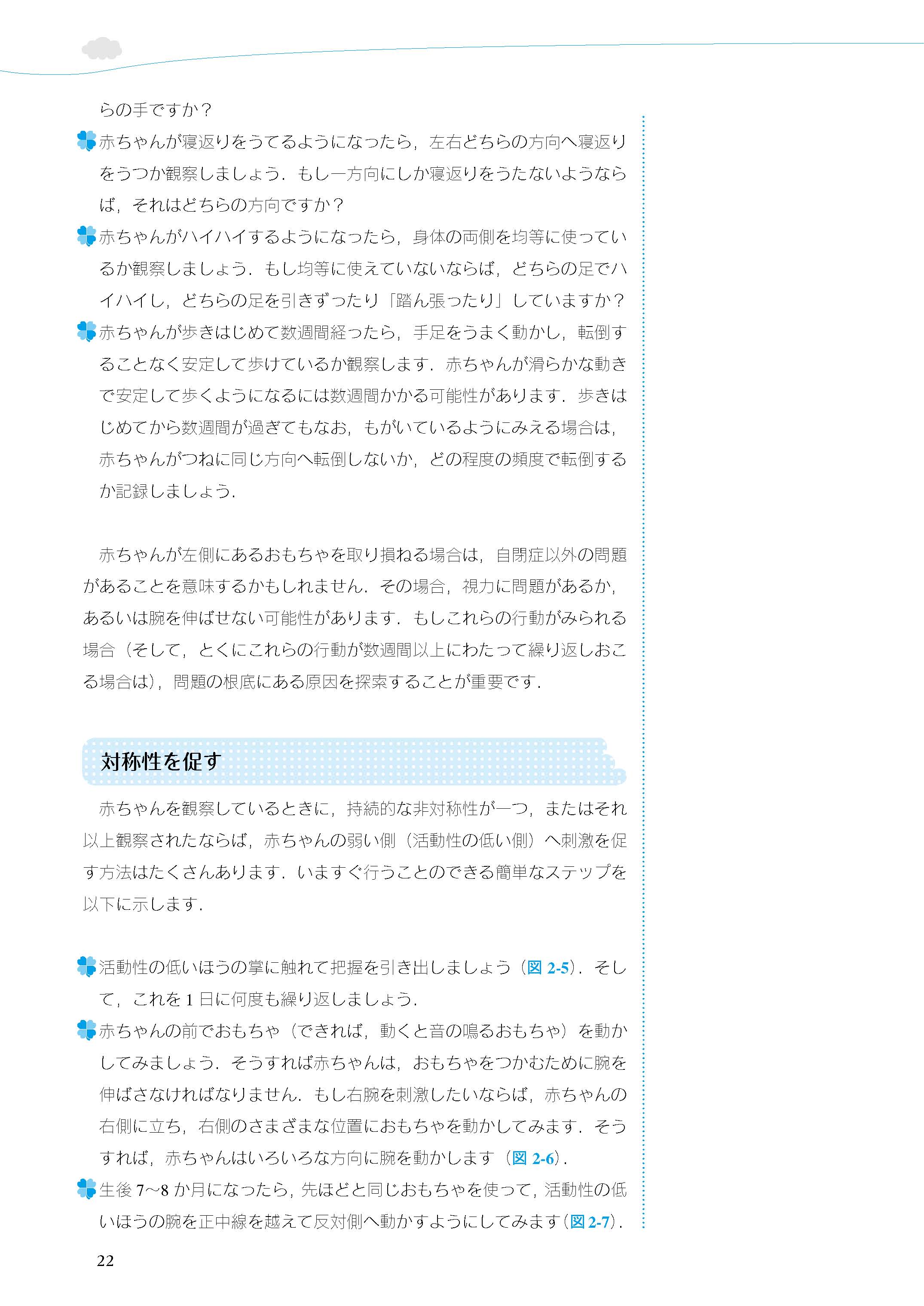 本書を日本で出版することができ心より嬉しく思うのと同時に,一抹の不安も覚えます.出版を考えたとき,この内容が果たして日本で受け入れられるものかどうか考え込んだからでした.最初にお断りしておきたいのは,本書が決して育児不安を煽ろうとしているものではないということです.また,乳児期早期に発達障害の確定診断が可能であると言っているわけでもありません.著者らが強調していることは,発達障害を示すかもしれない徴候が想像以上に早期にみられるということです.もちろん,その徴候は他の疾患(脳性麻痺,神経・筋疾患,代謝性疾患など)と区別がつかない場合も多々あります.ですが確定診断はさておき,発達に懸念を抱くことがあれば,待つことなく介入を始めてみようではありませんか,そう読者に呼びかけているのです.よりよく観察することは,よりよくかかわることに繋がると思います.