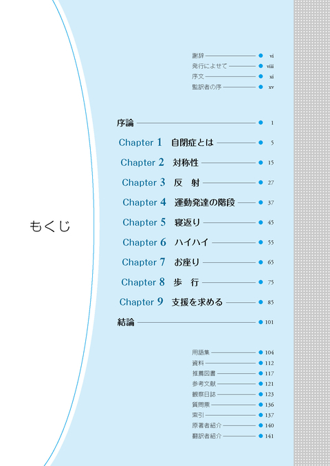 本書はTeitelbaumらの研究について,一般の方向けに書かれた平易な内容になっています.そのため翻訳に際しても,できる限りわかりやすい表現にするよう努めました.まず,Chapter 1~4で自閉症の概観と運動発達の問題に関する基本概念を総論的に紹介し,Chapter 5~8ではそれぞれの運動のマイルストーンについて各論的に運動の詳細が述べられています.本書の優れている点は,ただ運動の問題を指摘するにとどまらず,家庭で何に注目して運動を観察し,支援として何を実践したらよいか具体的に提示していることです.さらにChapter 9では,アメリカで行われている支援の実際が細かく紹介されています.専門用語に関しては,巻末の用語解説で著者らが説明を加えています.さらに,解説が不十分と思われる箇所や,日本の現状に沿っていないと思われる箇所には訳者注を付けました.用語については基本的に「小児科学会用語集」「小児神経学会用語集」に準拠しましたが,訳者が適宜和訳しています.また,“parents”の訳語は「親」に統一しました.