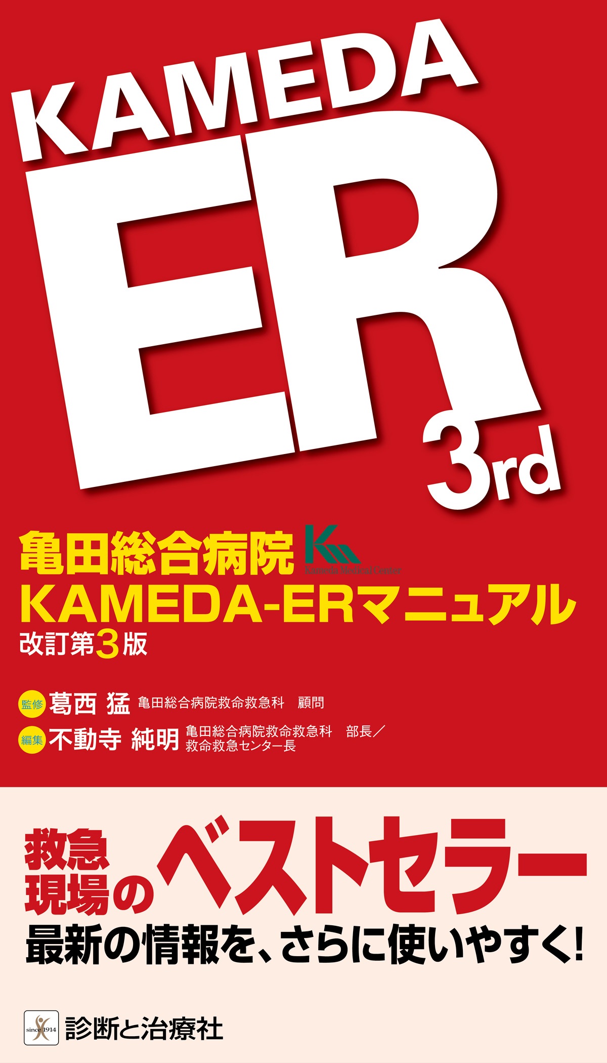「亀田総合病院 KAMEDA-ERマニュアル」は上記に述べた広範多岐にわたる救急患者の診断と治療を行ううえで,役立つようにhandyで内容も理解しやすいように作成しております.改訂第2版の発行以降,救急疾患の診断と治療のガイドラインがかなり変化してきたことから,改訂第2版から4年が経過した今日の時点で,改訂第3版を作成すべきではないかと考慮するに至った次第です.