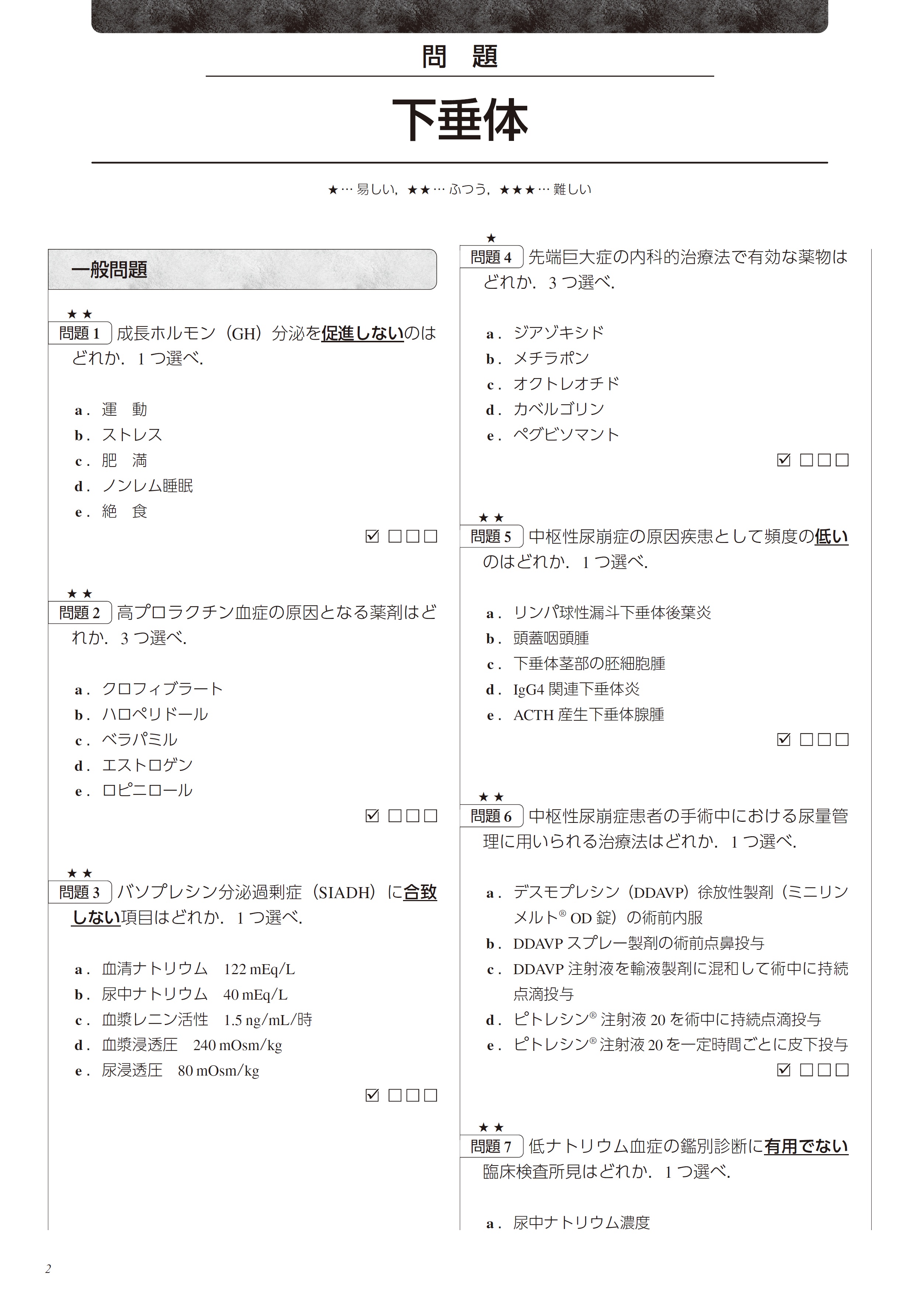 今回の改訂では,前版発行以降に変更のあった多くの主な診断基準・診療ガイドラインに対応して内容を大幅に刷新した.問題作成は前版と同様に内分泌代謝学の第一線の若手の先生方に,ブラッシュアップは中堅あるいは指導的立場で診療・教育に従事している先生方にお願いした.視床下部・下垂体から糖尿病までの各領域の問題をバランスよく配分し,参考とすべく各問題に難易度を付記した.執筆・ブラッシュアップを担当していただいた先生方にはご多忙なところ大変なご負担をおかけしたことを改めてお詫び申し上げるとともに,ご協力に深く感謝申し上げる次第である.本書がわが国の内分泌代謝学のセルフスタディのツールとして多くの臨床医に活用いただければ幸いである.