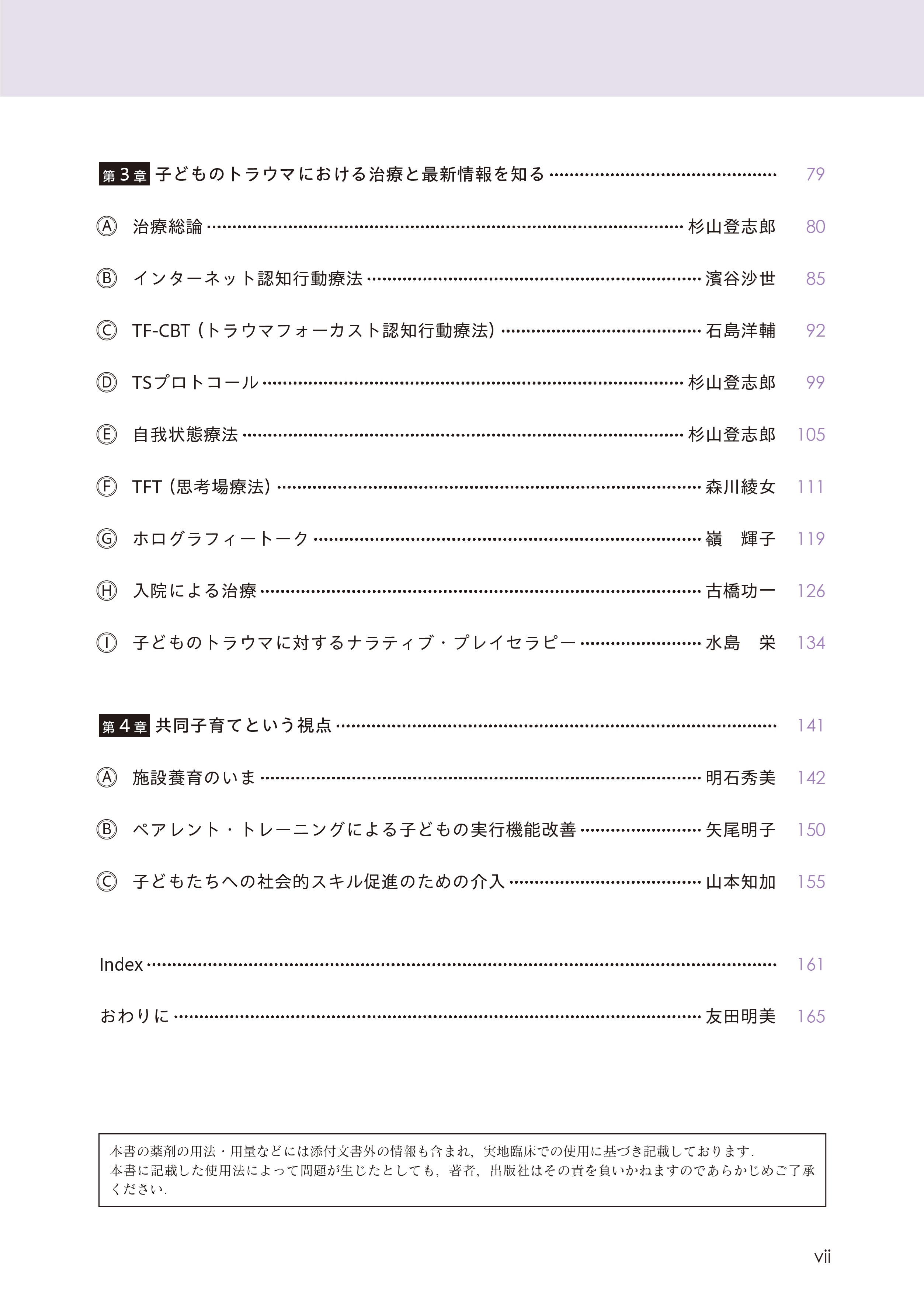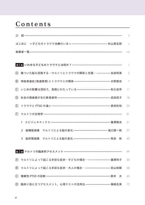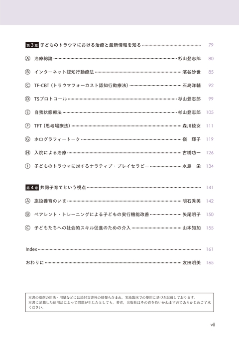 子どものトラウマへの治療は,当然ながら家族への治療も含む必要がある.こうして,わが国の子どもの状況を振り返ると,本書の意義がおのずから明らかになるのではないだろうか.本書は臨床の現場での実践を目的に書かれており,子どもとその家族のトラウマの「今日の治療」である.手元に置いていただき,対応に苦慮する症例に出会ったそのときに,臨床の場でめくって役立てていただきたい.