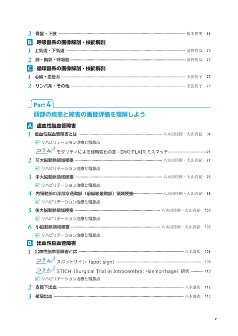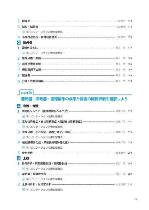 本書は,リハビリテーション医療に携わる医師,理学療法士,作業療法士,言語聴覚士,その他の職種を対象として各疾患を画像を通してみることを主眼においてまとめたものです.脳神経系,運動器,呼吸器,循環器の主要疾患,中枢から末梢まで,画像がその診断に用いられるものをなるべく取り上げました.それぞれの疾患についての各診療科の第一線の医師に執筆をお願いし,単に画像の見かたにとどまらず,各疾患の病態や標準的治療を簡潔に解説していただき,その画像との関係についての理解が深められるようにしました.また,「リハビリテーション治療と留意点」を各疾患に設け,疾患に対応した一般的なリハビリテーション治療の方針や禁忌,注意事項をあげていただきました.