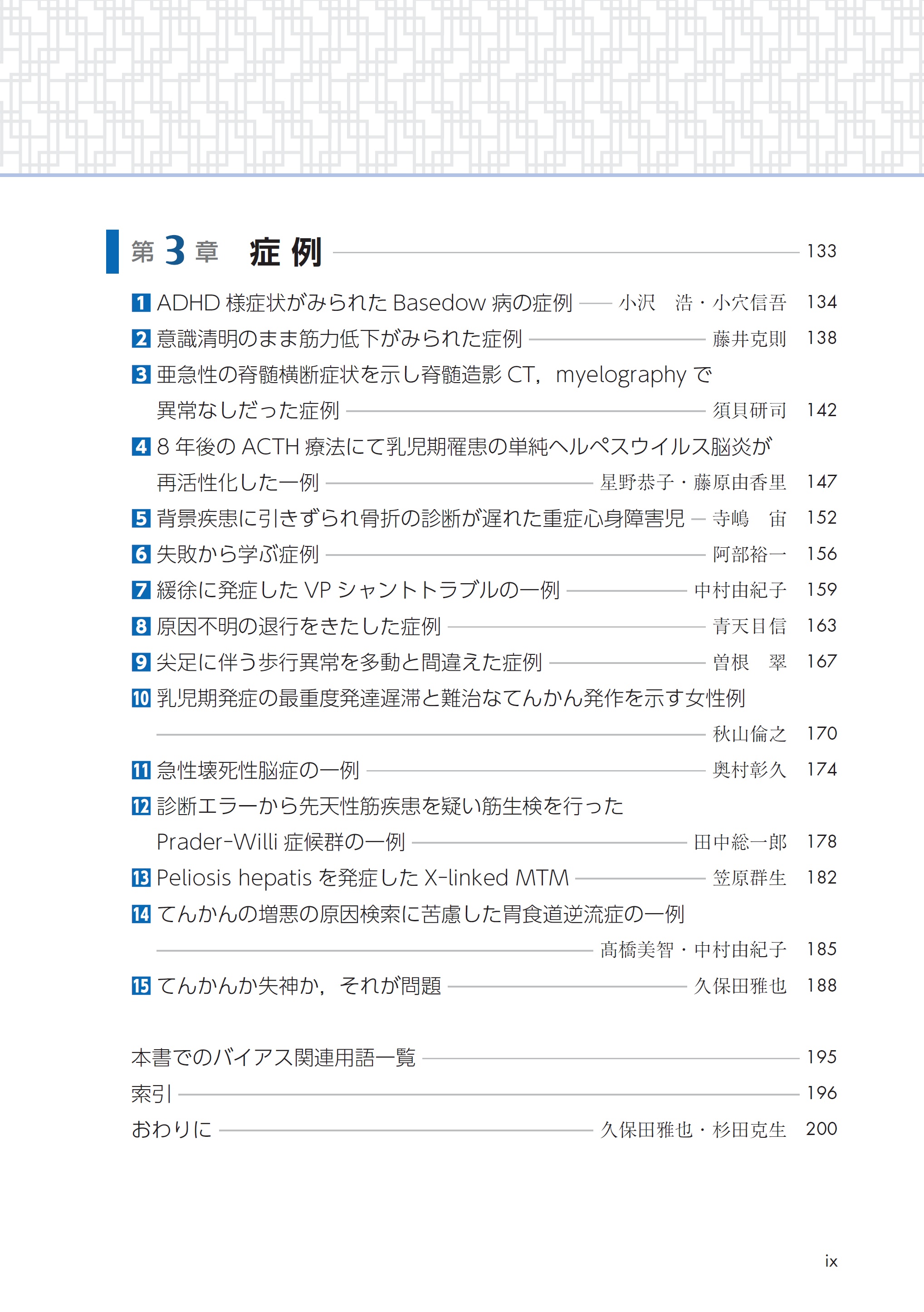 編者らは 2020~2023 年の日本小児神経学会のプレコングレスとして開催された実践教育セミナーにおいて「誤診から学ぶ」というテーマを企画し,さまざまな症例提示と振り返り,その構造解析,稀少疾患での 評価,歴史的背景を議論してきた.今回執筆していただいた執筆者のなかにもその参加者がおられる.講演時の内容をさらに洗練させた論考を寄せていただいた.そのほか,新たに多彩な領域で活動しておられるたくさんの臨床家,法律家にご執筆いただいた.今回の執筆に際しては誤診あるいは診断エラーに関するものであれば特に内容・形式を限定せず自由にご執筆いただいており,各項目においてそれぞれの「診断エラー学」が展開されている.言葉にならなかったことも含めて多くのことが共有され,豊かな学びになることを祈っている.なお,総論での相馬先生の指摘される様に,“diagnostic error”は「診断関連エラー」と称すべきだが,日本国内で通称されている「診断エラー」と記載したことをお断りする.また,診断エラーの要因としてのバイアス関連用語は統一させ,それぞれの欧文表記と和文表記を資料として一覧した.