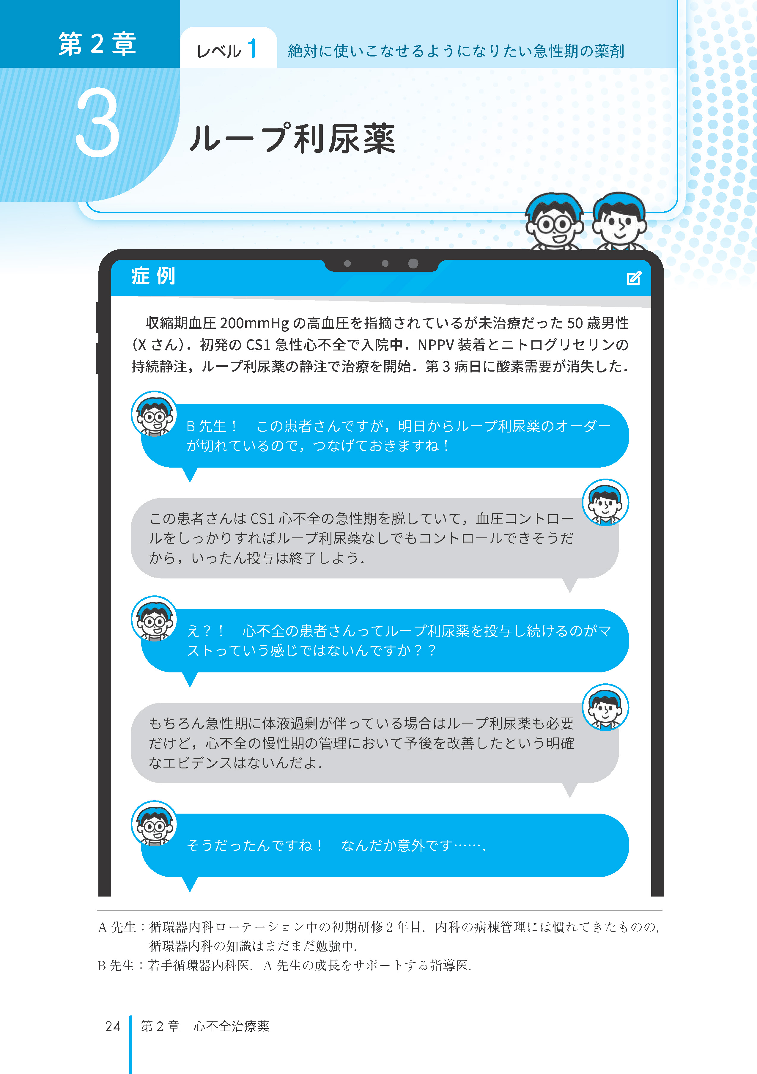 つまり,「自分で新しく心不全治療薬を処方してみよう!」というコンセプトではなく,心不全の患者さんが飲んでいる薬から,どんな心不全なのか? を想起でき,この薬はこういう意図だろうな,この患者さんは注意が必要だぞ,などとざっくりと評価できるようになることが目標です.そうなることで,循環器専門医とのコミュニケーションも円滑になり,よりよいチーム医療が実践できるのです.