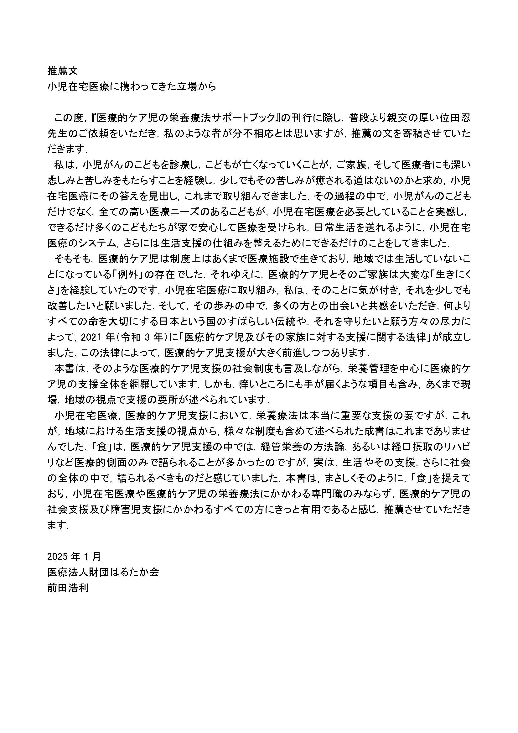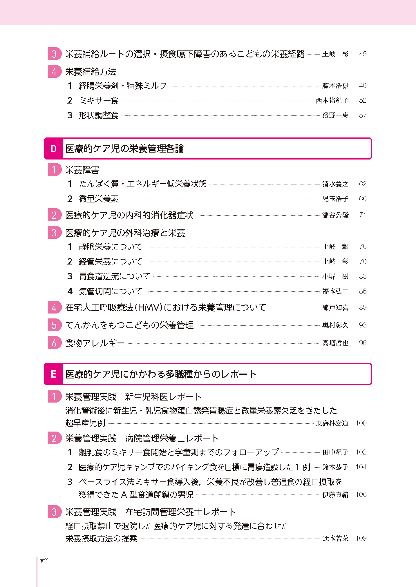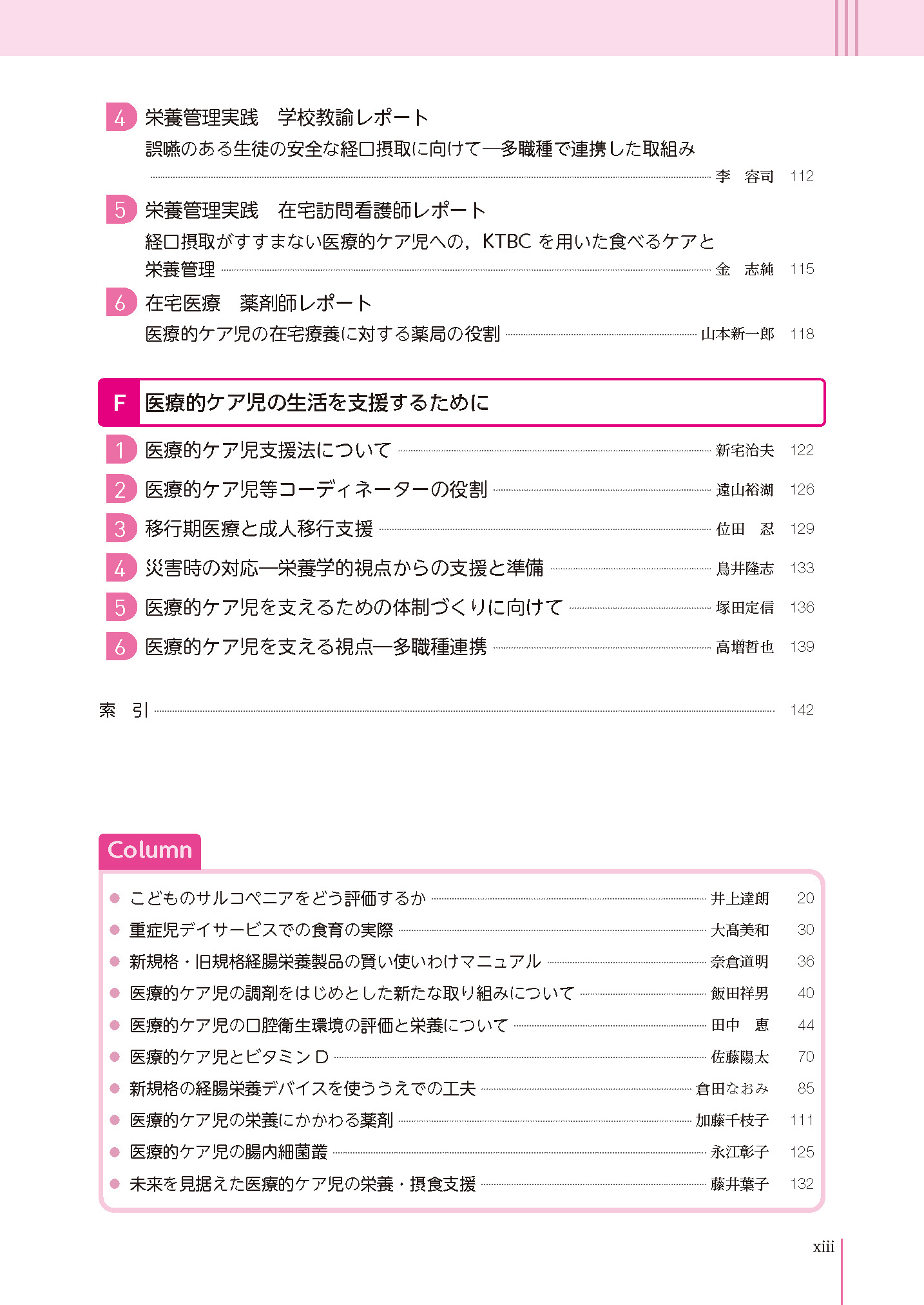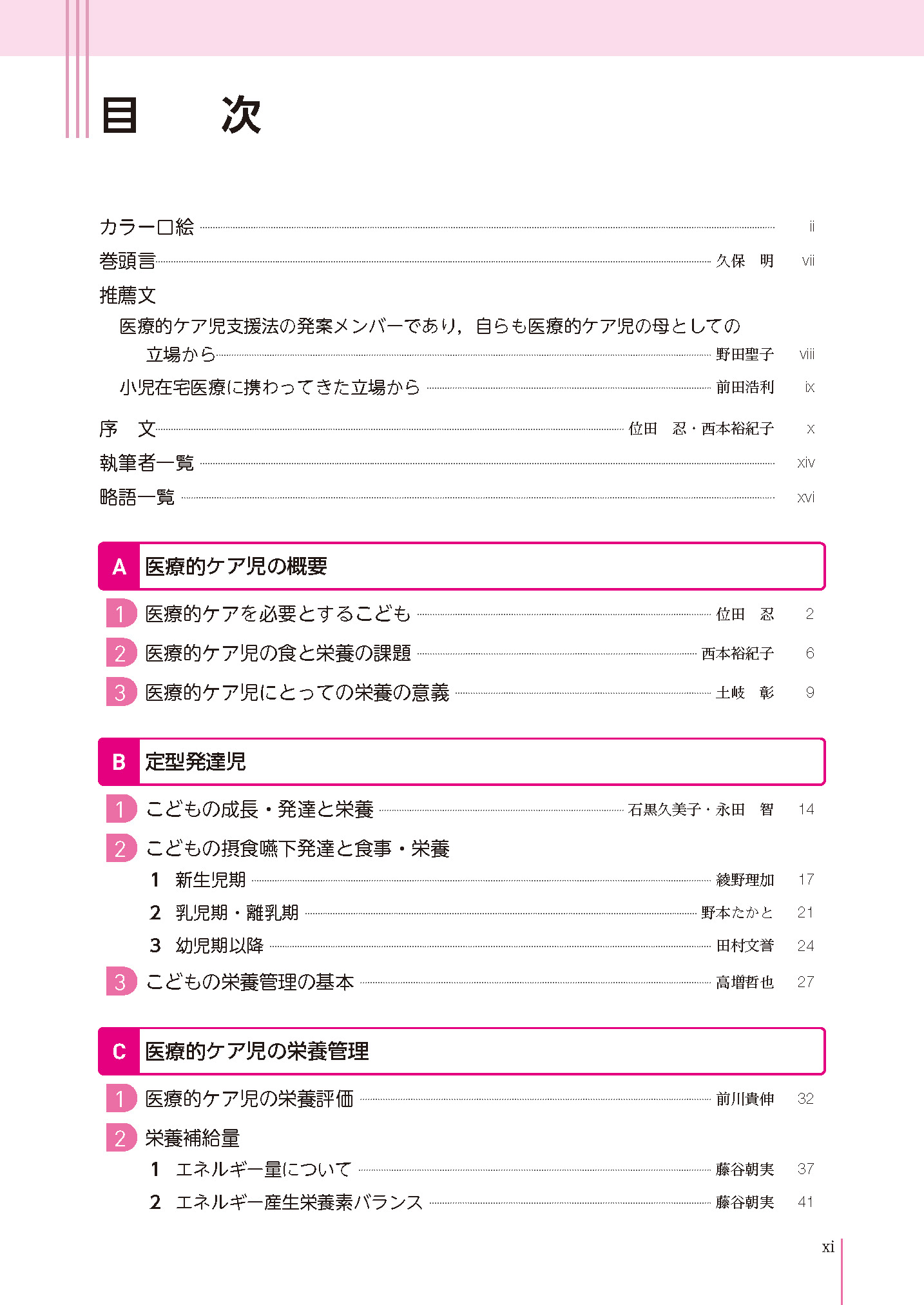 医療的ケア児それぞれの個性を尊重し,「食を楽しむ」力を育み,“喜び”につなげる栄養支援は,医療的ケア児および家族が当たり前の生活を送るために必須のスキルと考える.本書が医療的ケア児にかかわる皆様に役立つ書籍となれば幸甚である.