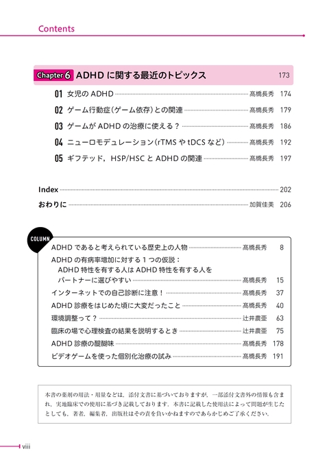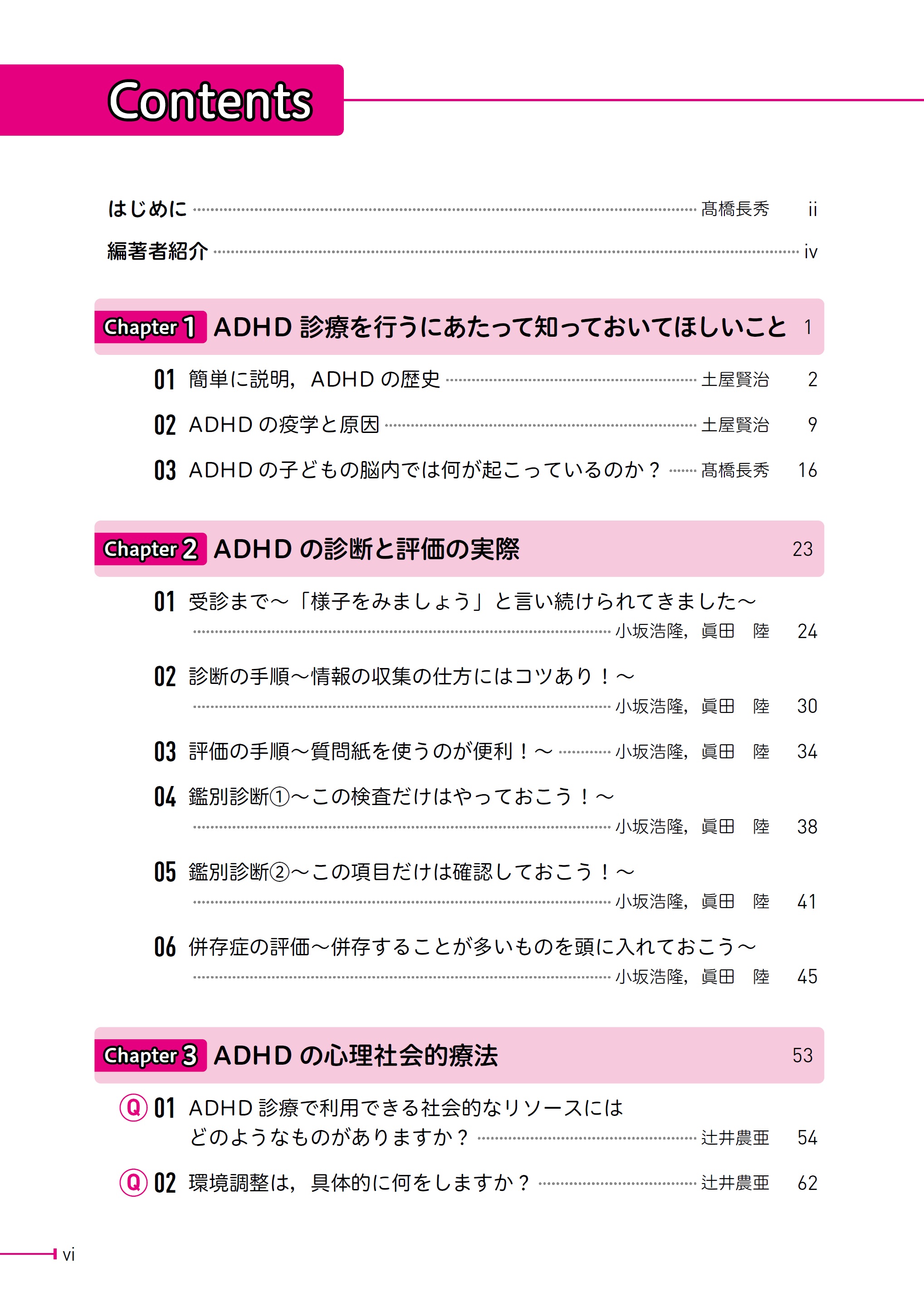 謝辞:まず,本書を手に取ってくださったすべての先生方,本当にありがとうございます.本書が,ADHD診療をはじめられる先生方にとっての道標となり,ADHDの子どもたちの発達を支え,彼らがもつ可能性を最大限に引き出すための一助となることを願っています.本書の完成は,過去の偉大な先達が築いた基盤と,世界中の研究者たちによる厳密なデータ収集があってこそ成しえたことです.多くのADHDの子どもたちとその養育者からの貴重な意見も,この作業を支えてくれました.