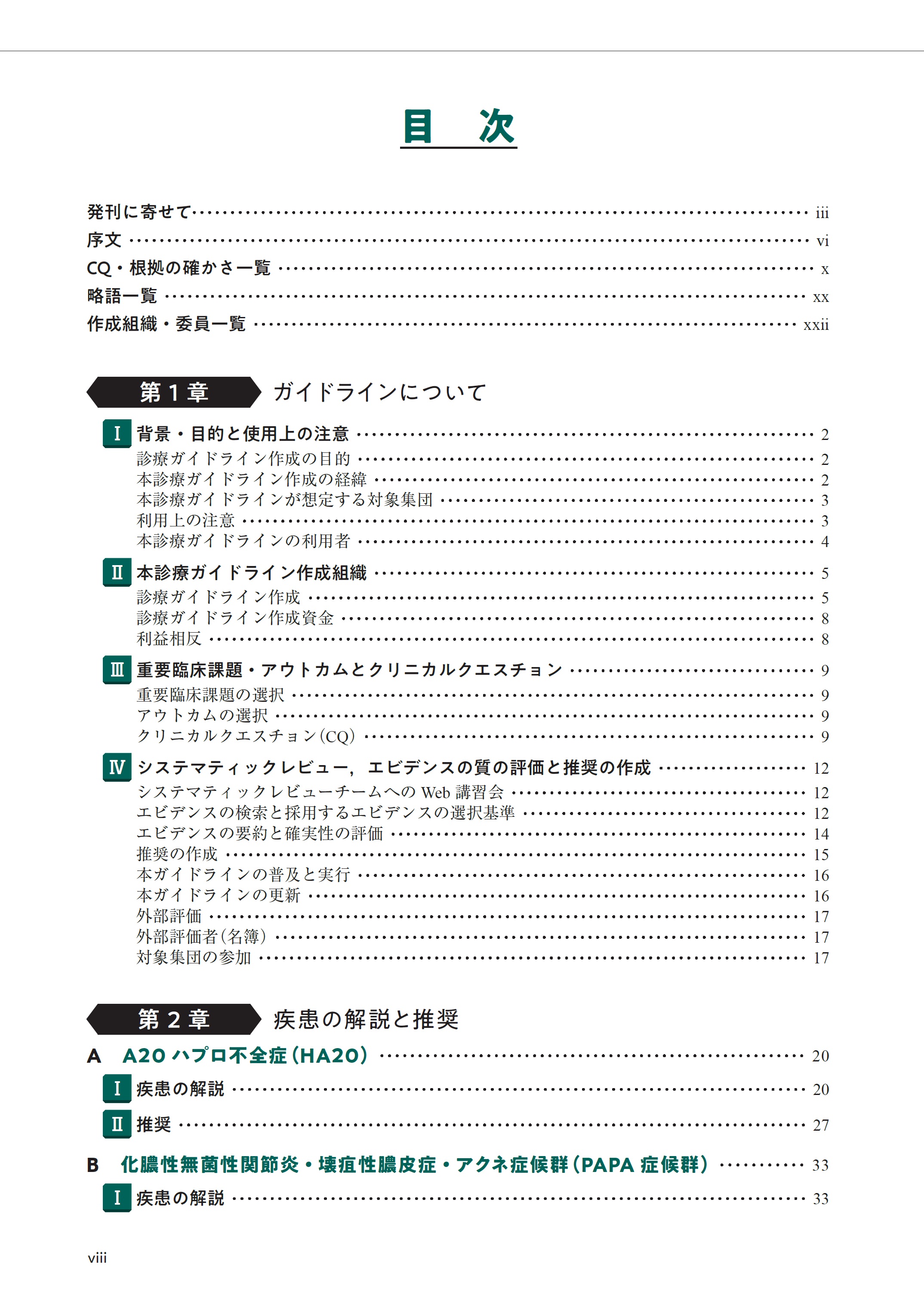 以上の背景をもとに,令和2年からの厚生労働科学研究費補助金 疾病・障害対策研究分野 難治性疾患政策研究事業「自己炎症性疾患とその類縁疾患の全国診療体制整備,移行医療体制の構築,診療ガイドライン確立に関する研究」班において,「自己炎症性疾患診療ガイドライン2017」の改訂を行った.今回の改訂では前回作成疾患から家族性地中海熱,周期性発熱・アフタ口内炎・咽頭炎・頸部リンパ節炎症候群をとりあげ改訂,新規疾患として比較的患者数の多いA20ハプロ不全症,中條・西村症候群,化膿性無菌性関節炎・壊疽性膿皮症・アクネ症候群のガイドライン作成を行い,日本リウマチ学会,日本免疫不全・自己炎症学会,日本小児リウマチ学会の協力を得て,このたび「自己炎症性疾患診療ガイドライン2026」の発刊の運びとなった.