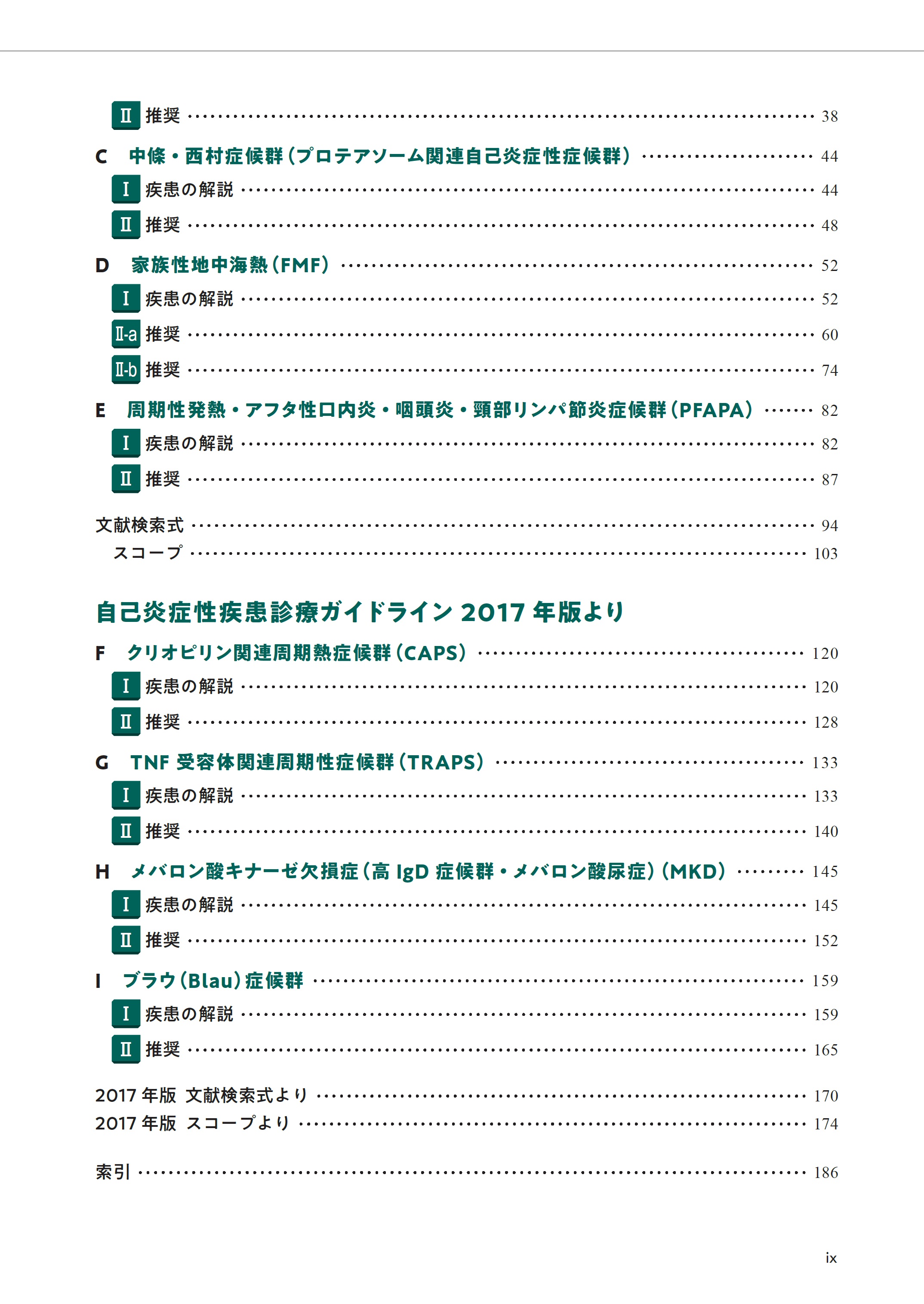 このような状況下,平成26年度からの厚生労働科学研究費補助金難治性疾患等政策研究事業「自己炎症性疾患とその類縁疾患の診断基準,重症度分類,診療ガイドライン確立に関する研究」班,日本小児リウマチ学会の協力を得て,家族性地中海熱,クリオピリン関連周期熱症候群,TNF受容体関連周期性症候群,メバロン酸キナーゼ欠損症,ブラウ症候群,周期性発熱・アフタ口内炎・咽頭炎・頸部リンパ節炎症候群について「自己炎症性疾患診療ガイドライン2017」を発行した.