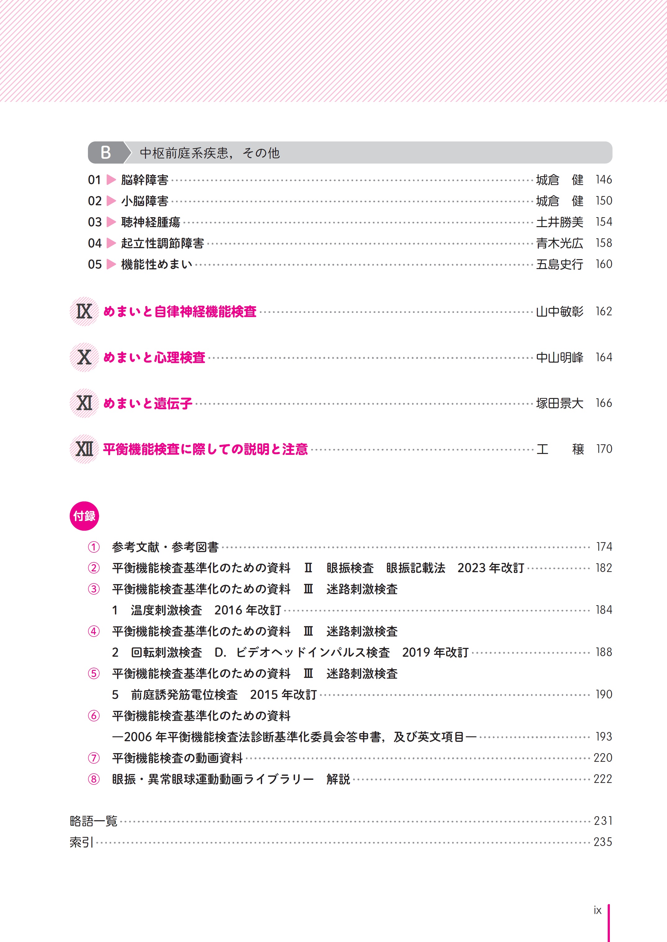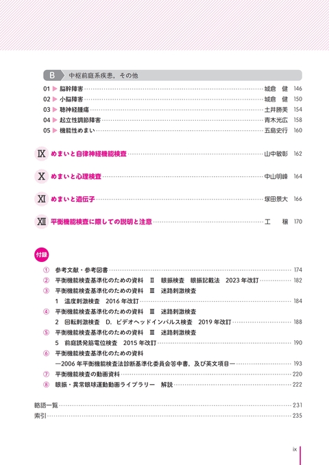 付録に関しても,日本めまい平衡医学会の平衡機能検査基準化のための資料の改訂や追加にあわせて充実させています.これらの資料は,改訂の足跡がわかるよう,オリジナルを基本としています.眼振と異常眼球運動に関する解説も掲載しています.動画ライブラリー資料とあわせてご一読いただければと思います.動画ライブラリーや平衡機能検査の実際を解説する動画資料は,日本めまい平衡医学会のホームページから購入できます.ぜひ,あわせてご参考にしていただければと存じます.
