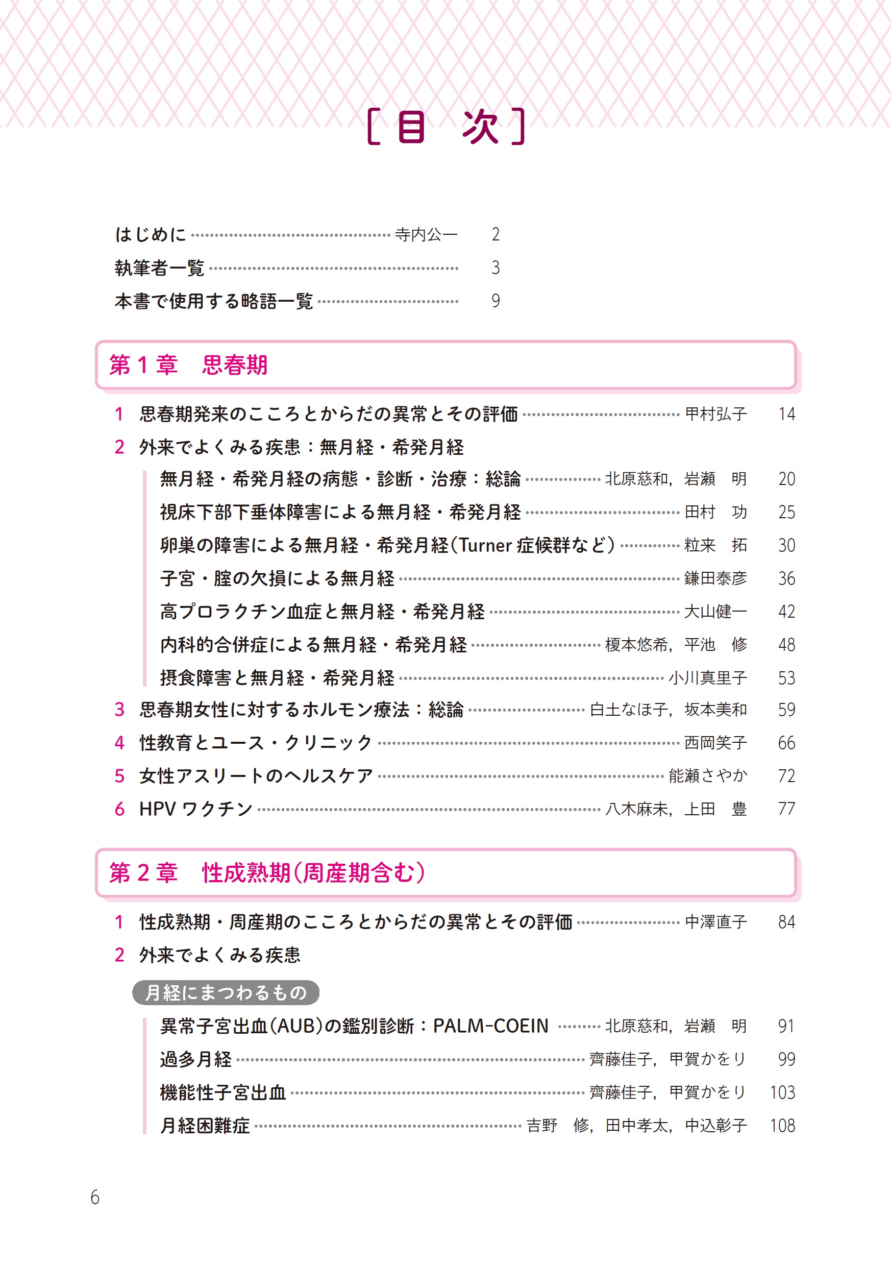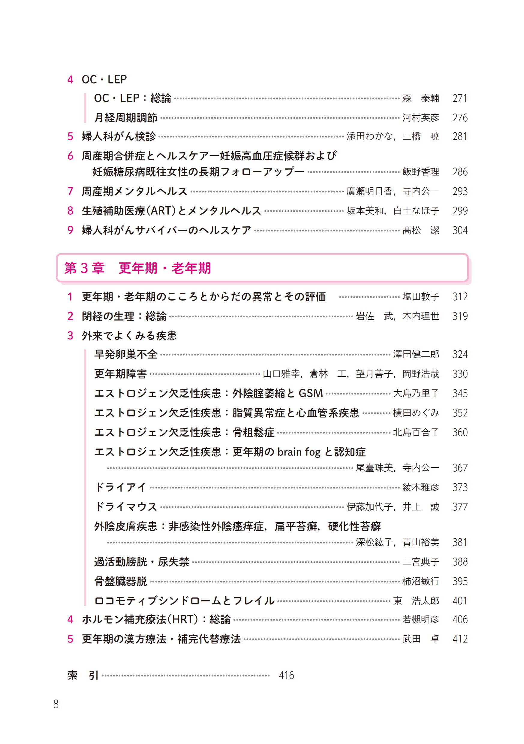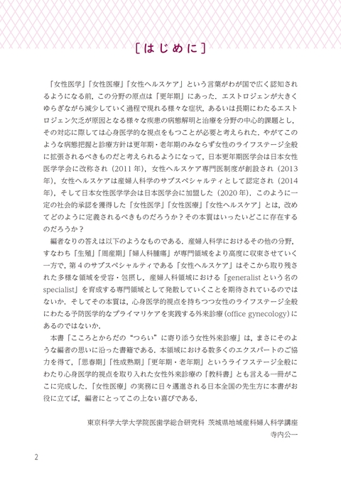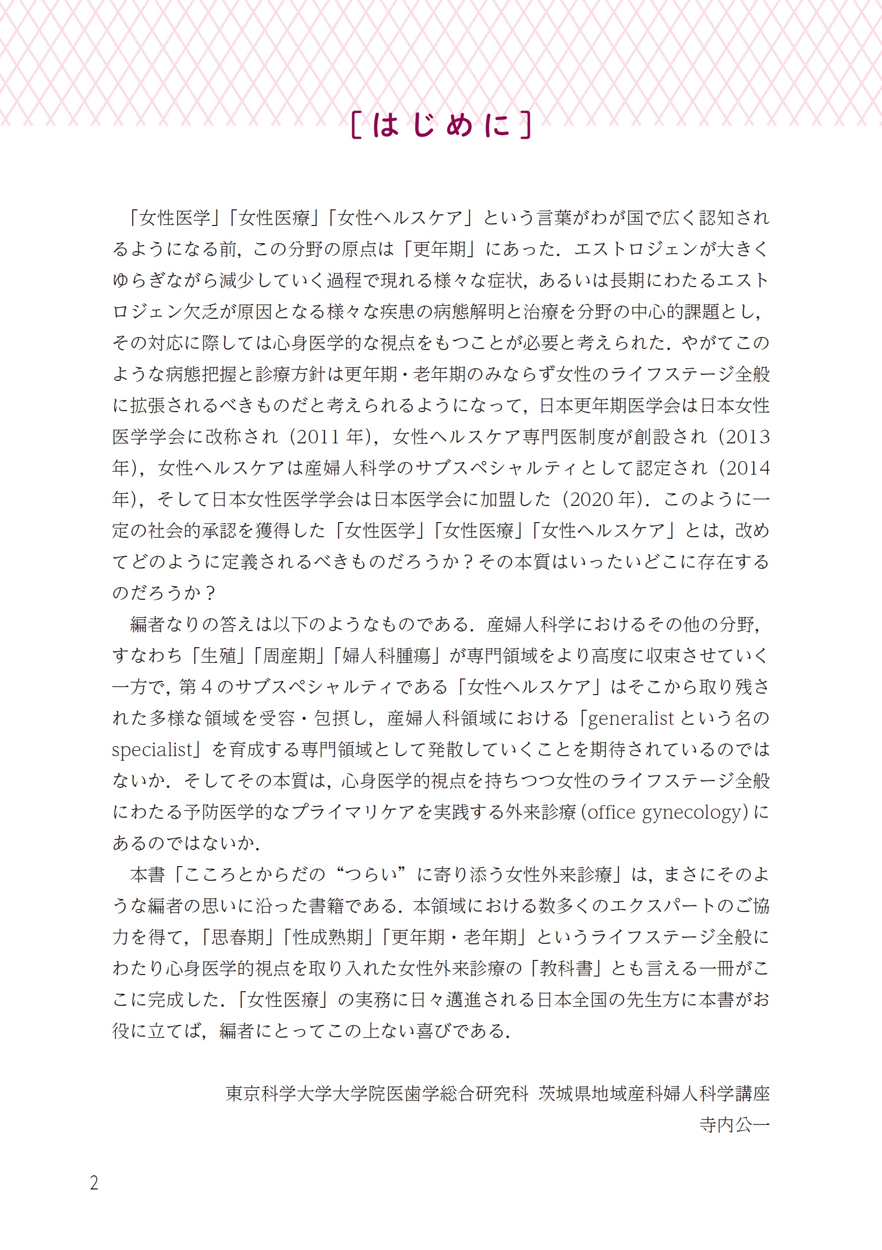 本書「こころとからだの“つらい”に寄り添う女性外来診療」は,まさにそのような編者の思いに沿った書籍である.本領域における数多くのエクスパートのご協力を得て,「思春期」「性成熟期」「更年期・老年期」というライフステージ全般にわたり心身医学的視点を取り入れた女性外来診療の「教科書」とも言える一冊がここに完成した.「女性医療」の実務に日々邁進される日本全国の先生方に本書がお役に立てば,編者にとってこの上ない喜びである.