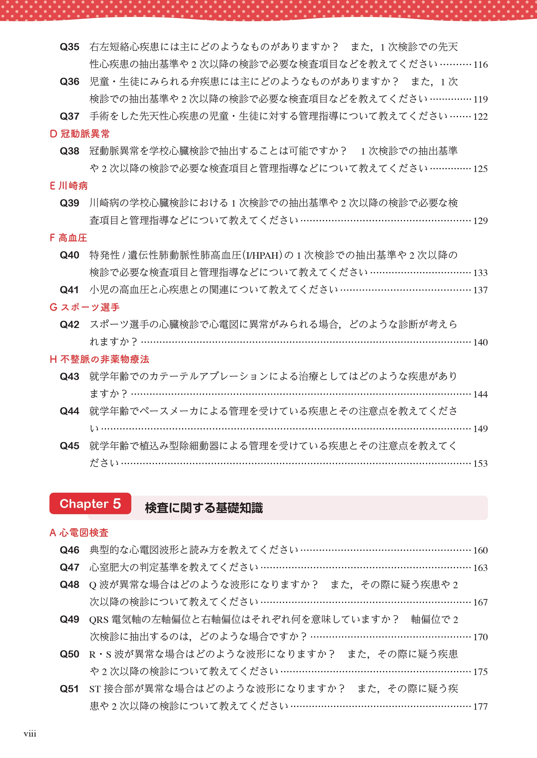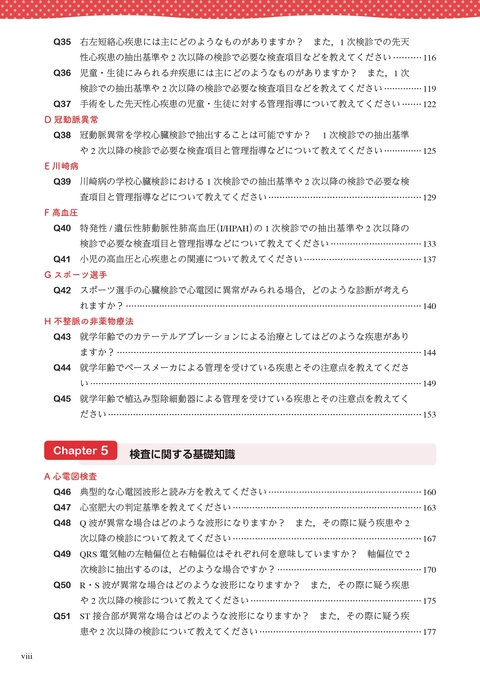 Chapter 5は学校心臓検診を行う際にみられる種々の心電図変化,聴診所見,X線検査所見,心エコー所見などをどのように取り扱えばいいのか,その後の検査をどうするのかなどを具体的に示してある.
