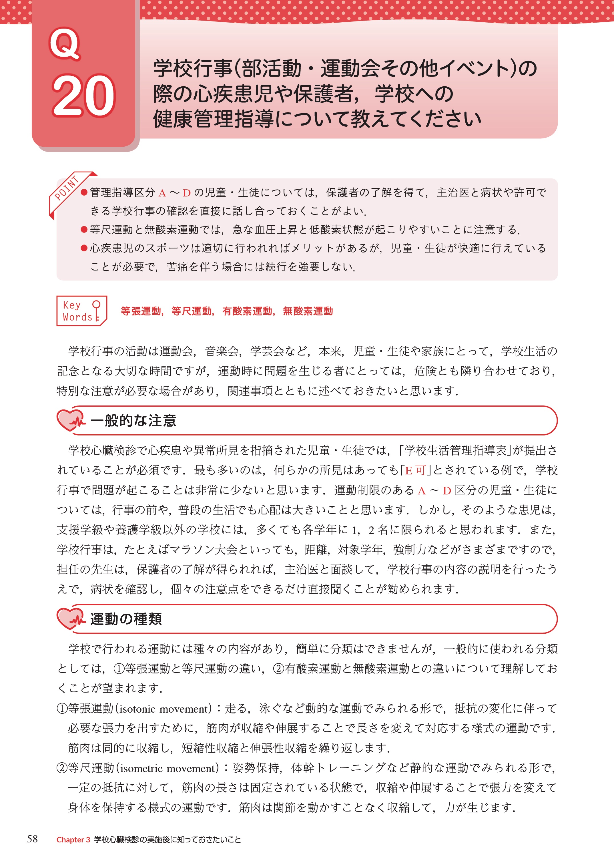 Chapter 3は学校心臓検診を行った後にどのように指導を行っていくか,その管理指導方法,突然死予防を記載した.児童・生徒にQOLの高い学校生活を送ってもらい,突然死を予防することは学校心臓検診の重要な目的である.学校行事での具体的な管理方法,指導のポイントなども挙げてあり,学校関係の養護教諭,担任教諭にも参考にしてもらいたい.