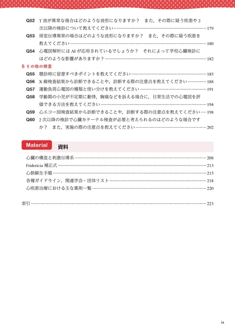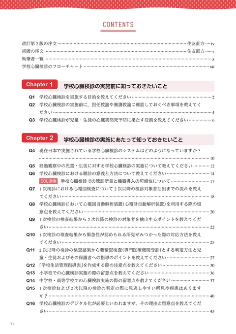 将来はデジタル化,AI判読など学校心臓検診全体の方法も変化してくる可能性がある.心疾患の新たな治療薬剤,デバイス治療,カテーテル治療,心臓移植なども開発されており,管理をうまく行うことができれば児童・生徒のQOLを保つことができる可能性が増えている.本書が学校心臓検診に関わる循環器医,小児科医,循環器を専門にしていない医師,養護教諭,担任教諭の参考になれば幸いである.