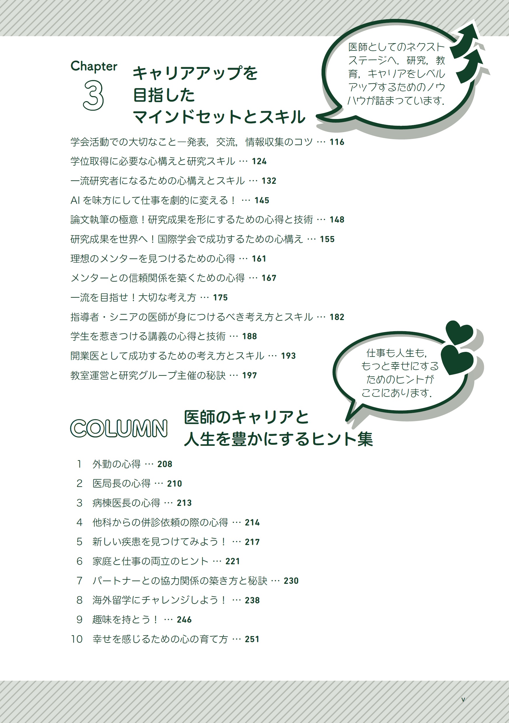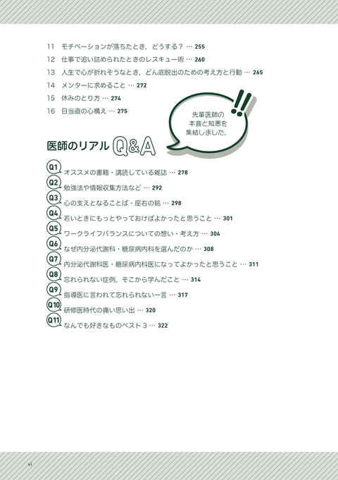 本書はおもに糖尿病・内分泌内科を専攻している医師が執筆していますが,多くの項目はすべての医師にとって,さらにいえば,社会人として奮闘されている医師以外の方にとっても大切なこと,人生に役立つメッセージが満載されていますので,広く読んでいただけることを願っています.また本書は,教科書でもエビデンスを記載したガイドラインでもありませんので,最初から通読する必要はありません.人生に迷ったとき,疲れたとき,困ったとき,辛いときにふと手に取っていただき,心に響いた項目を寝転びながら気楽に読んでいただくのがよいと思います.