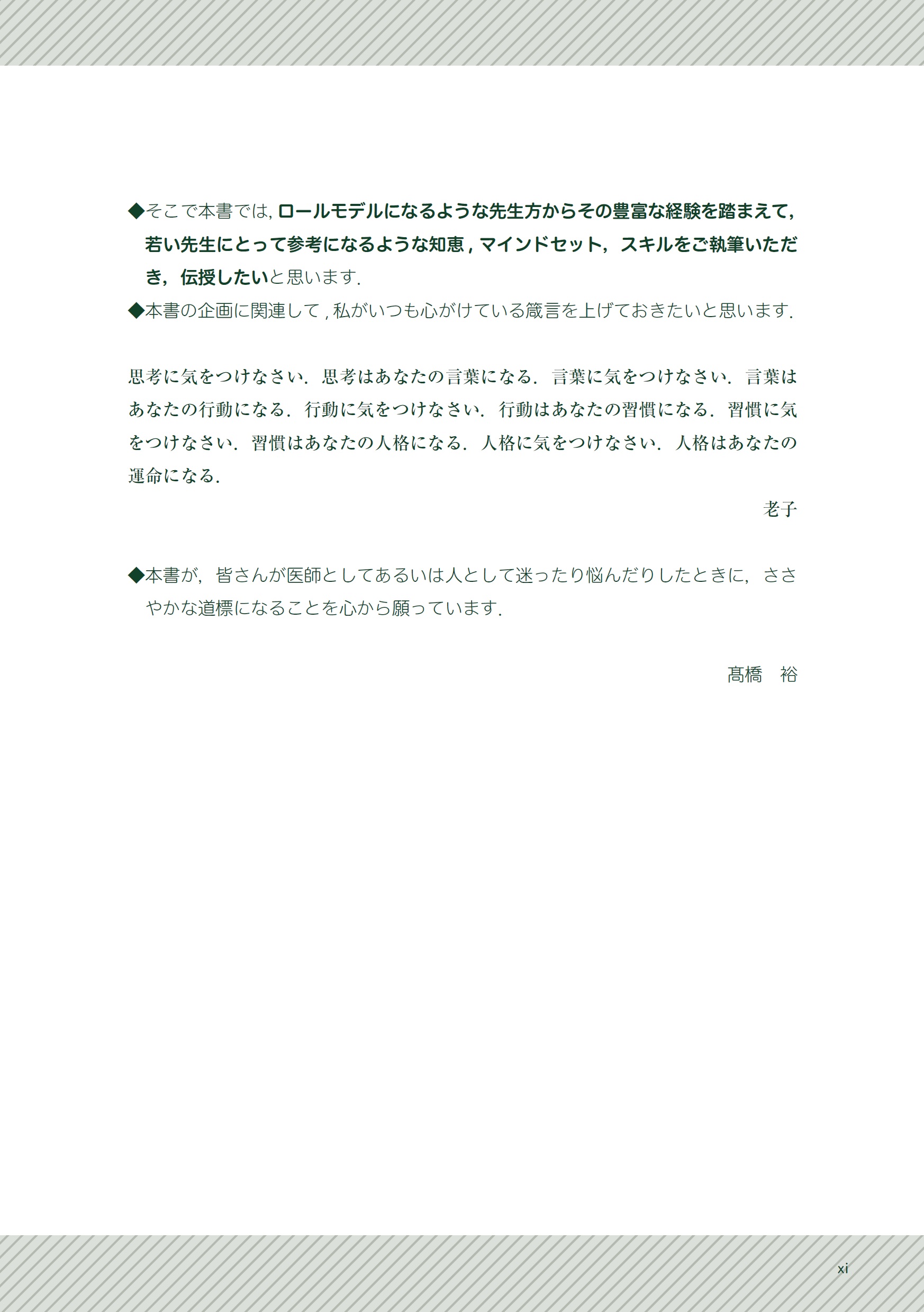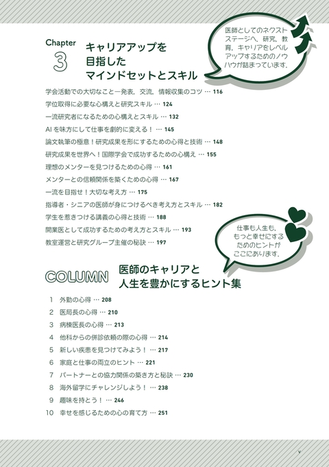 本書が,医師としての第一歩を踏み出した若手世代,これから医師を目指す学部学生のメンターとなり,若いときの心構え・考え方,行動の道標となって,医師として豊かな人生を歩んでいただきたいと思います.