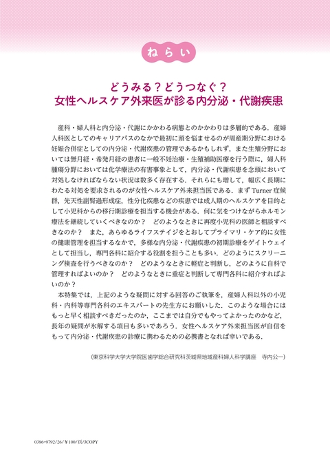 産科・婦人科と内分泌・代謝にかかわる病態とのかかわりは多層的である.産婦人科医としてのキャリアパスのなかで最初に頭を悩ませるのが周産期分野における妊娠合併症としての内分泌・代謝疾患の管理であるかもしれず,また生殖分野においては無月経・希発月経の患者に一般不妊治療・生殖補助医療を行う際に,婦人科腫瘍分野においては化学療法の有害事象として,内分泌・代謝疾患を念頭において対処しなければならない状況は数多く存在する.それらにも増して,幅広く長期にわたる対処を要求されるのが女性ヘルスケア外来担当医である.まずTurner症候群,先天性副腎過形成症,性分化疾患などの疾患では成人期のヘルスケアを目的として小児科からの移行期診療を担当する機会がある.何に気をつけながらホルモン療法を継続していくべきなのか? どのようなときに再度小児科の医師と相談すべきなのか? また,あらゆるライフステイジをとおしてプライマリ・ケア的に女性の健康管理を担当するなかで,多様な内分泌・代謝疾患の初期診療をゲイトウェイとして担当し,専門各科に紹介する役割を担うことも多い.どのようにスクリーニング検査を行うべきなのか? どのようなときに軽症と判断し,どのように自科で管理すればよいのか? どのようなときに重症と判断して専門各科に紹介すればよいのか?