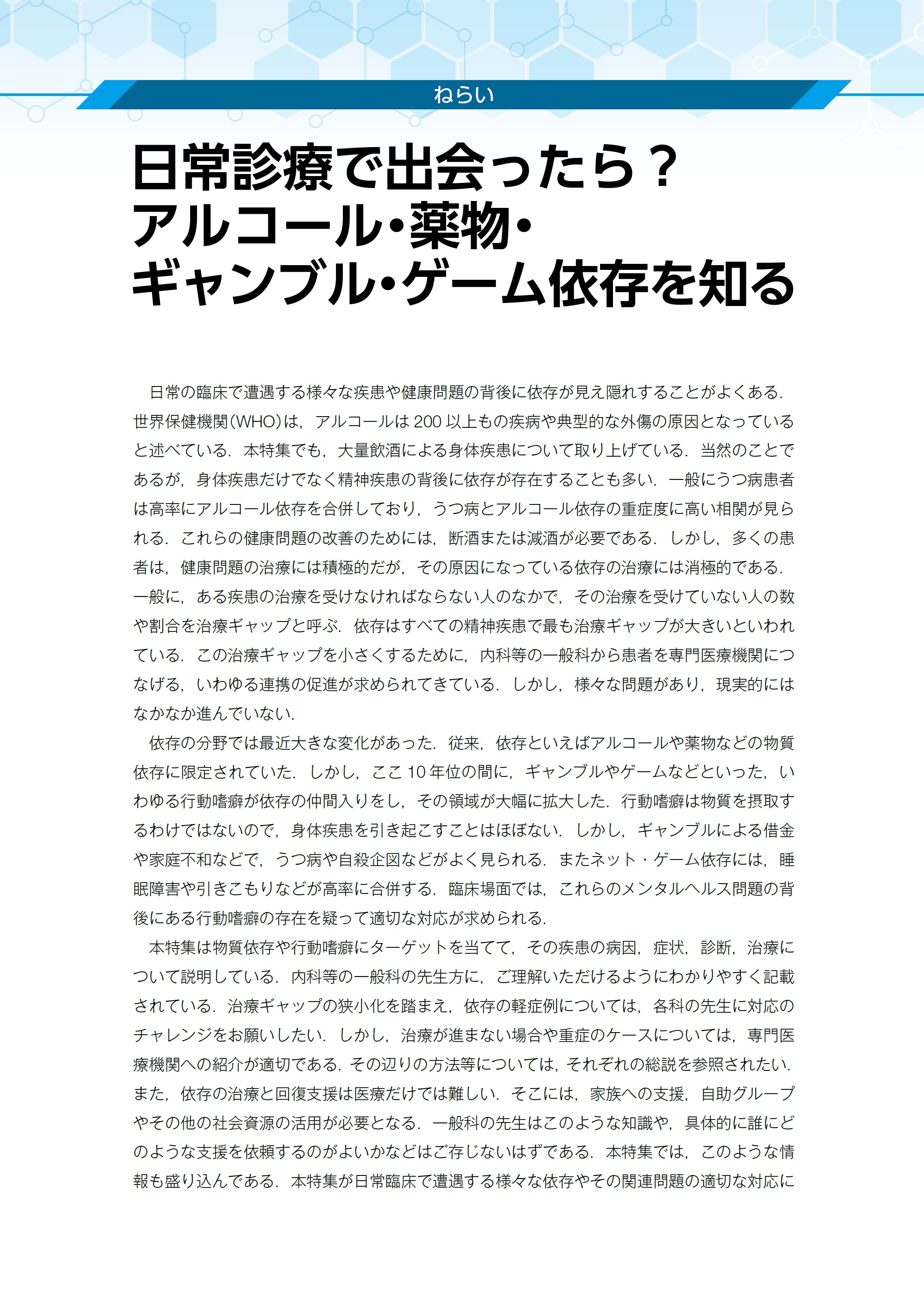本特集は物質依存や行動嗜癖にターゲットを当てて,その疾患の病因,症状,診断,治療について説明している.内科等の一般科の先生方に,ご理解いただけるようにわかりやすく記載されている.治療ギャップの狭小化を踏まえ,依存の軽症例については,各科の先生に対応のチャレンジをお願いしたい.しかし,治療が進まない場合や重症のケースについては,専門医療機関への紹介が適切である.その辺りの方法等については,それぞれの総説を参照されたい.また,依存の治療と回復支援は医療だけでは難しい.そこには,家族への支援,自助グループやその他の社会資源の活用が必要となる.一般科の先生はこのような知識や,具体的に誰にどのような支援を依頼するのがよいかなどはご存じないはずである.本特集では,このような情報も盛り込んである.本特集が日常臨床で遭遇する様々な依存やその関連問題の適切な対応に貢献できることを願う.