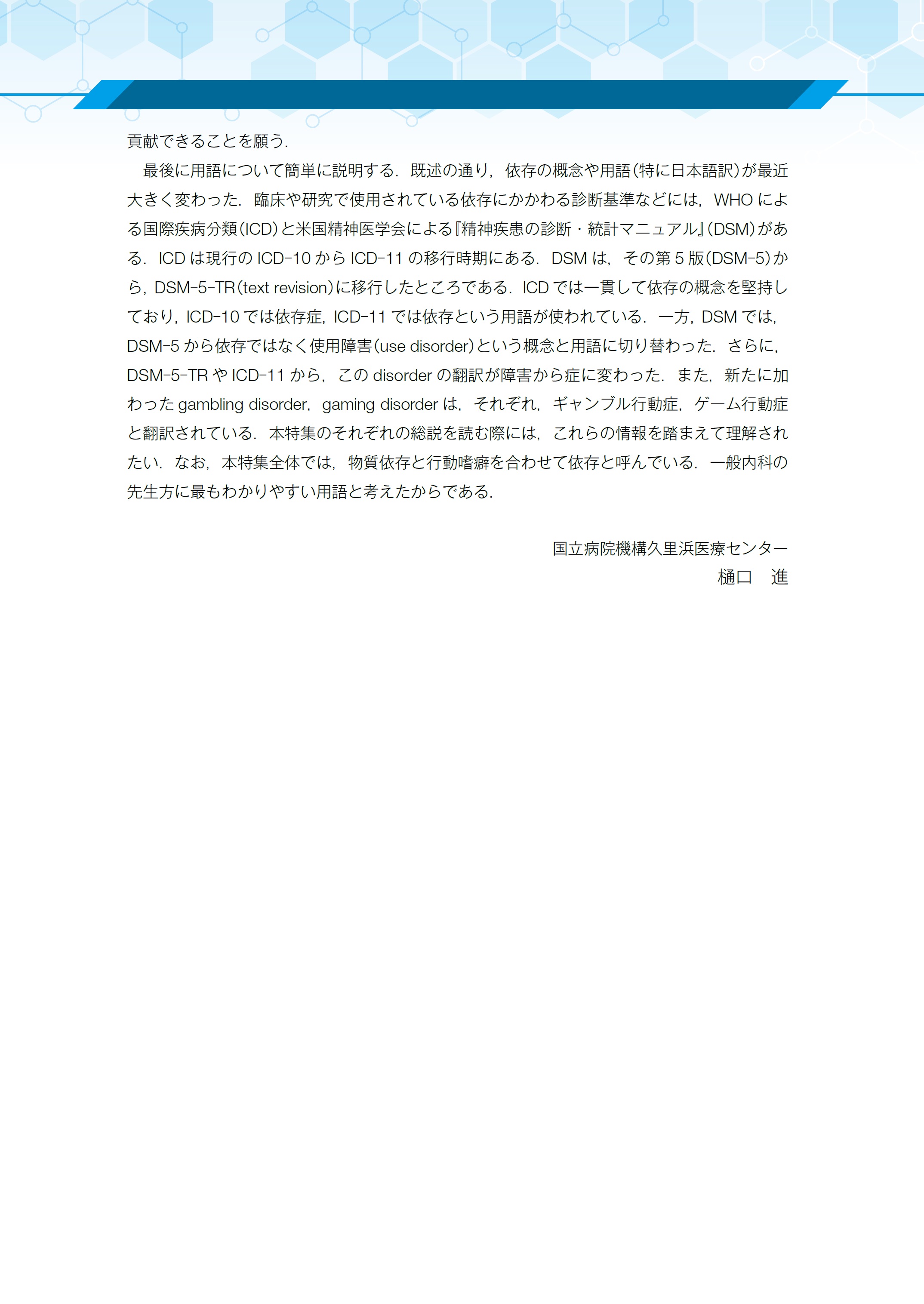 最後に用語について簡単に説明する.既述の通り,依存の概念や用語(特に日本語訳)が最近大きく変わった.臨床や研究で使用されている依存にかかわる診断基準などには,WHOによる国際疾病分類(ICD)と米国精神医学会による『精神疾患の診断・統計マニュアル』(DSM)がある.ICDは現行のICD-10からICD-11の移行時期にある.DSMは,その第5版(DSM-5)から,DSM-5-TR(text revision)に移行したところである.ICDでは一貫して依存の概念を堅持しており,ICD-10では依存症,ICD-11では依存という用語が使われている.一方,DSMでは,DSM-5から依存ではなく使用障害(use disorder)という概念と用語に切り替わった.さらに,DSM-5-TRやICD-11から,このdisorderの翻訳が障害から症に変わった.また,新たに加わったgambling disorder,gaming disorderは,それぞれ,ギャンブル行動症,ゲーム行動症と翻訳されている.本特集のそれぞれの総説を読む際には,これらの情報を踏まえて理解されたい.なお,本特集全体では,物質依存と行動嗜癖を合わせて依存と呼んでいる.一般内科の先生方に最もわかりやすい用語と考えたからである.