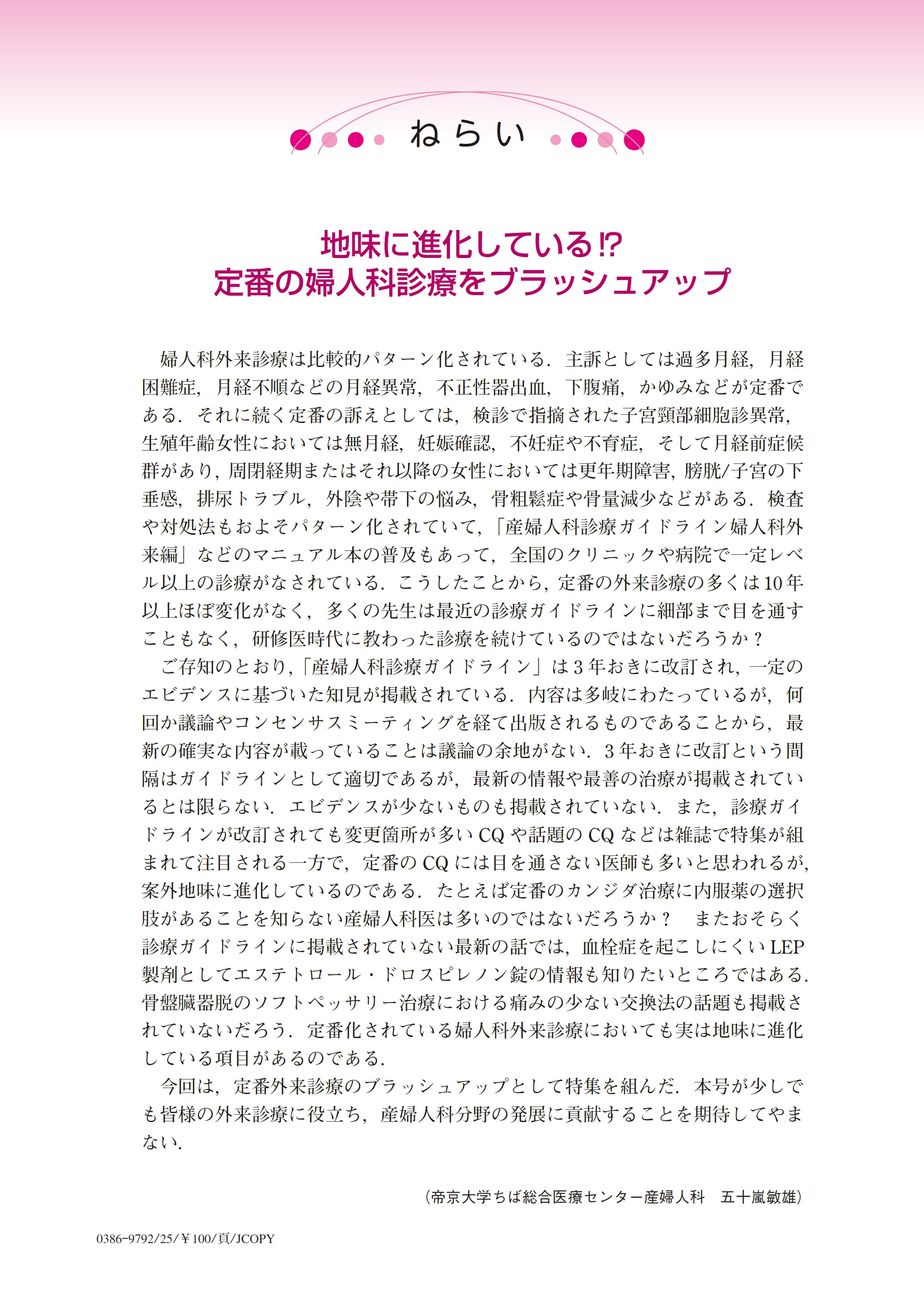 婦人科外来診療は比較的パターン化されている.主訴としては過多月経,月経困難症,月経不順などの月経異常,不正性器出血,下腹痛,かゆみなどが定番である.それに続く定番の訴えとしては,検診で指摘された子宮頸部細胞診異常,生殖年齢女性においては無月経,妊娠確認,不妊症や不育症,そして月経前症候群があり,周閉経期またはそれ以降の女性においては更年期障害,膀胱/子宮の下垂感,排尿トラブル,外陰や帯下の悩み,骨粗鬆症や骨量減少などがある.検査や対処法もおよそパターン化されていて,「産婦人科診療ガイドライン婦人科外来編」などのマニュアル本の普及もあって,全国のクリニックや病院で一定レベル以上の診療がなされている.こうしたことから,定番の外来診療の多くは10年以上ほぼ変化がなく,多くの先生は最近の診療ガイドラインに細部まで目を通すこともなく,研修医時代に教わった診療を続けているのではないだろうか?