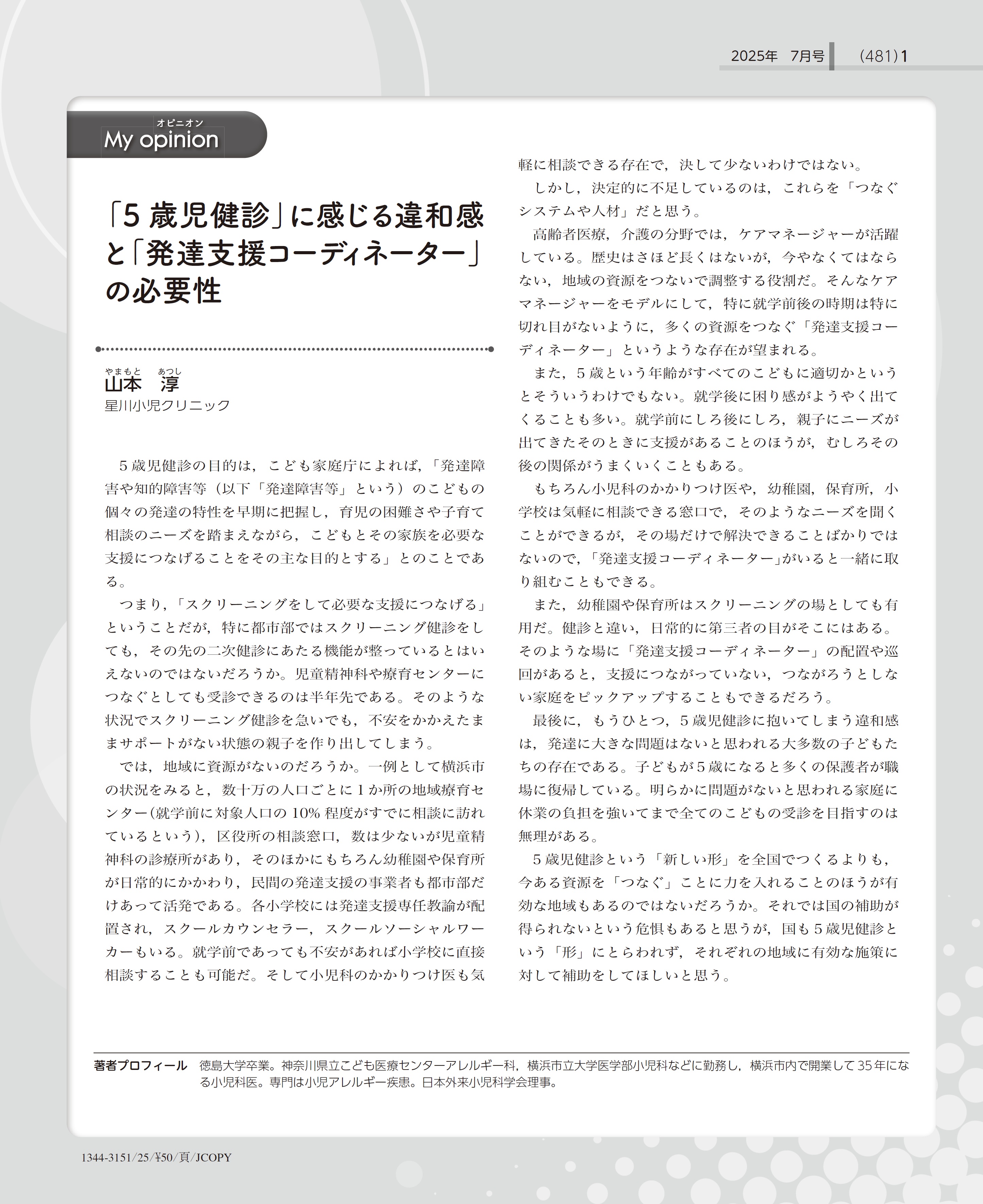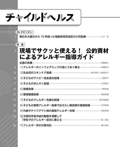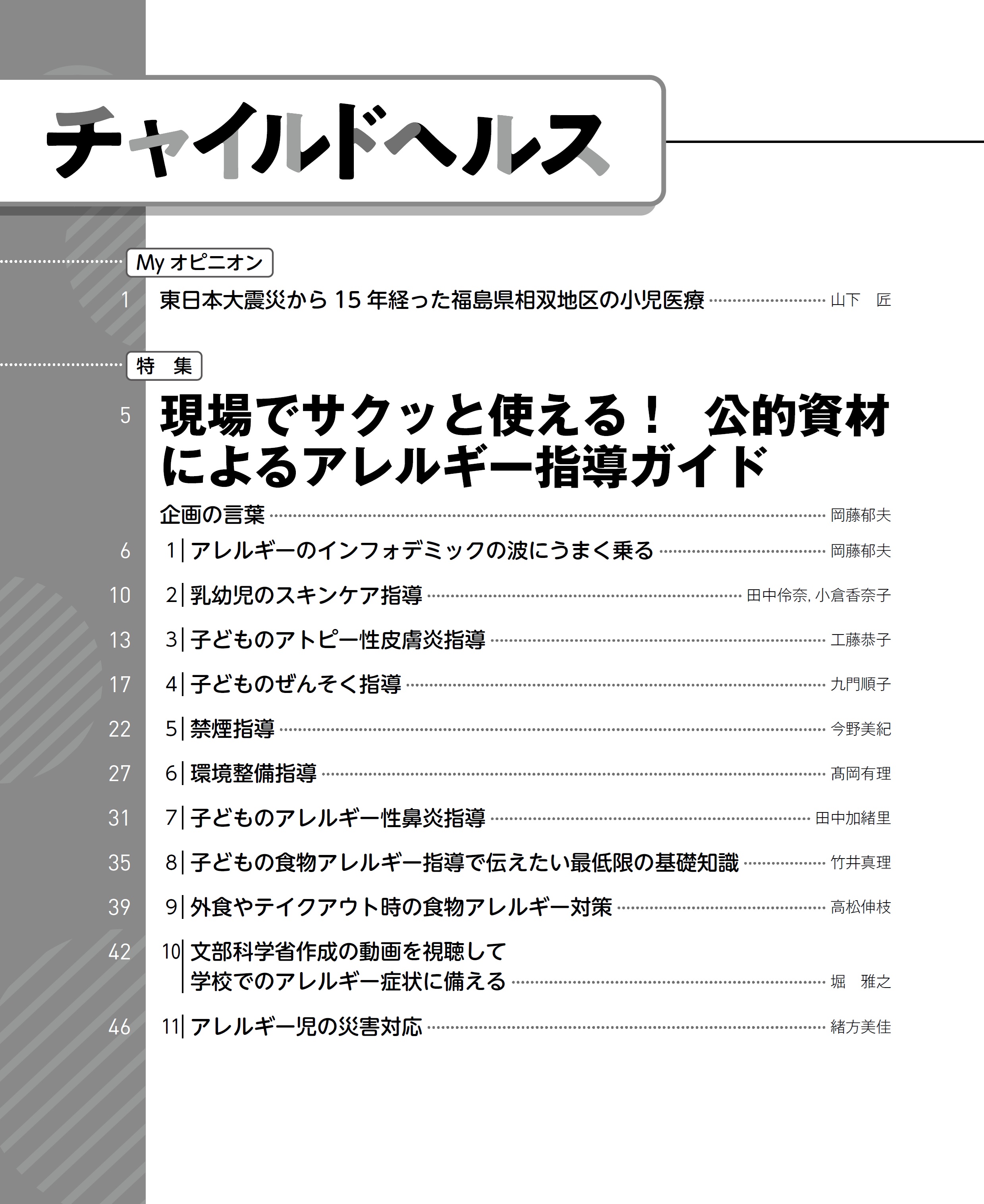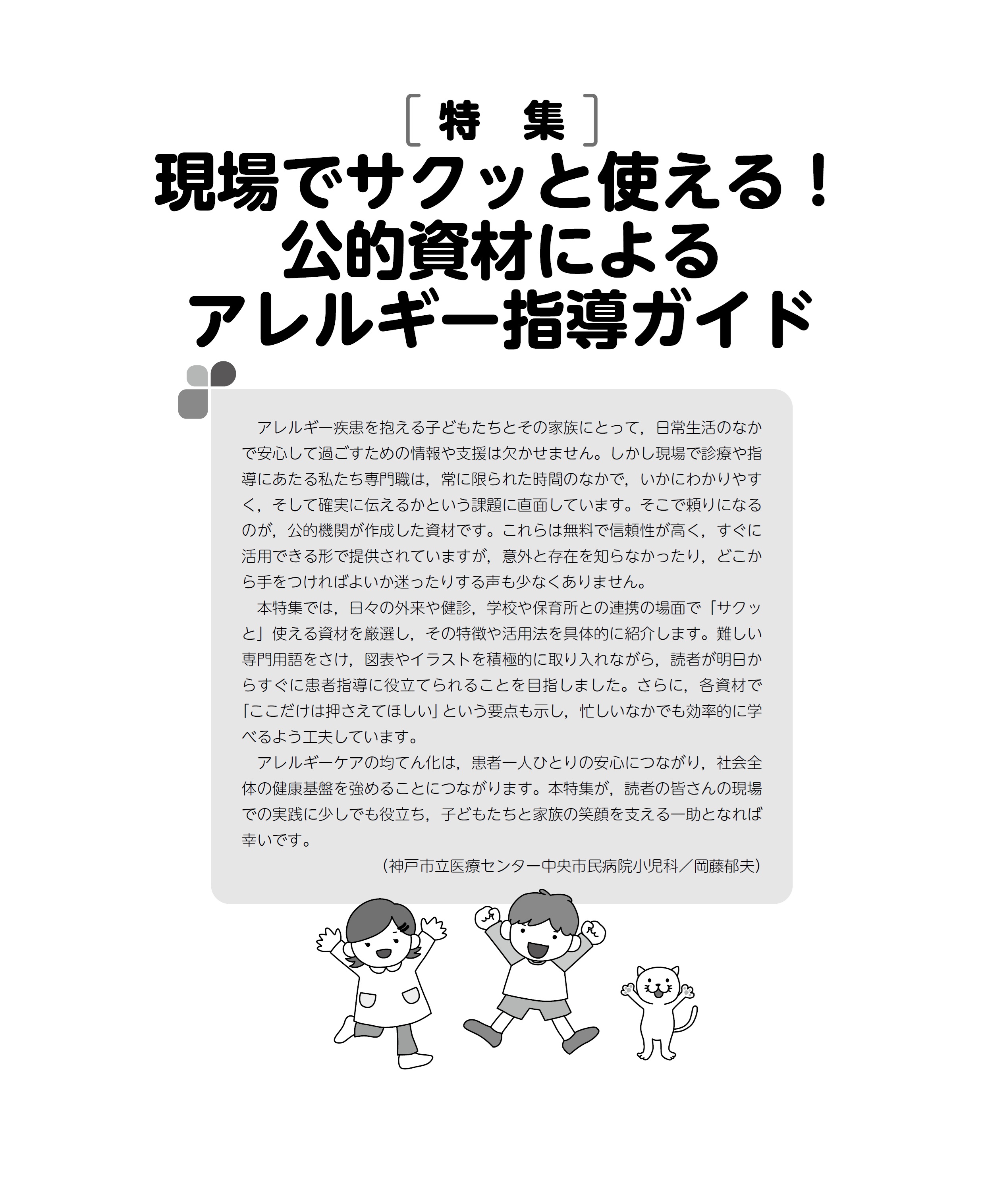 アレルギーケアの均てん化は,患者一人ひとりの安心につながり,社会全体の健康基盤を強めることにつながります.本特集が,読者の皆さんの現場での実践に少しでも役立ち,子どもたちと家族の笑顔を支える一助となれば幸いです.